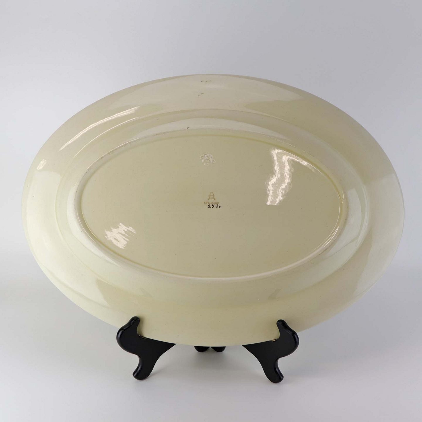 Stor ovalt serveringsfad i fajance fra stellet Åkjær, som blev fremstillet i perioden 1934-1939. Nr. 253