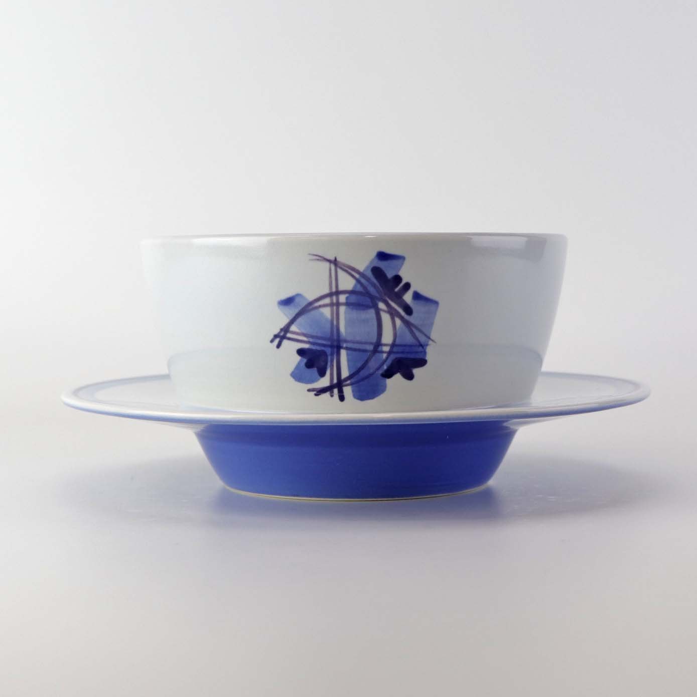 Fajancestel i stelform CA med dekoration af abstrakt motiv i blå og lyseblå på en råhvid baggrund.