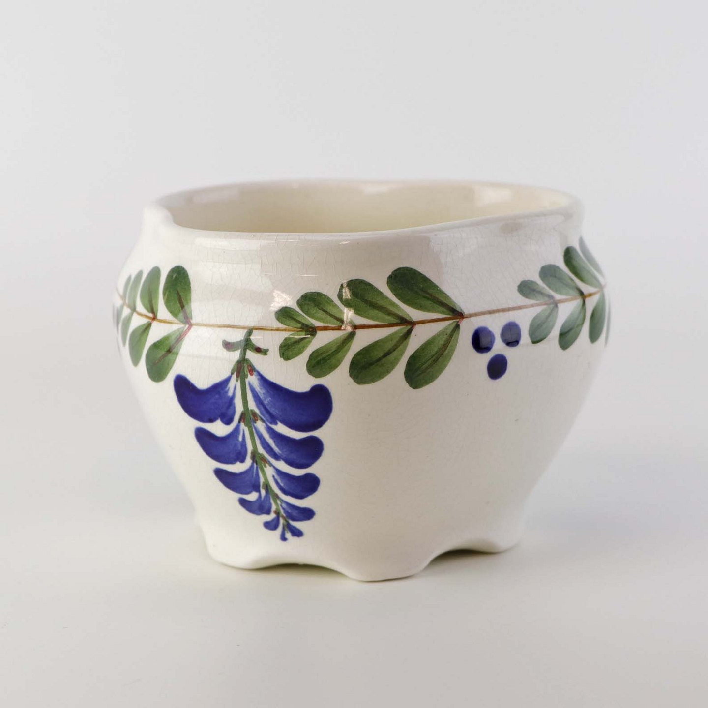 Fajancestel med dekoration af ranker af blåregn og blade på lys baggrund afsluttet med kant af runde blå pletter.
