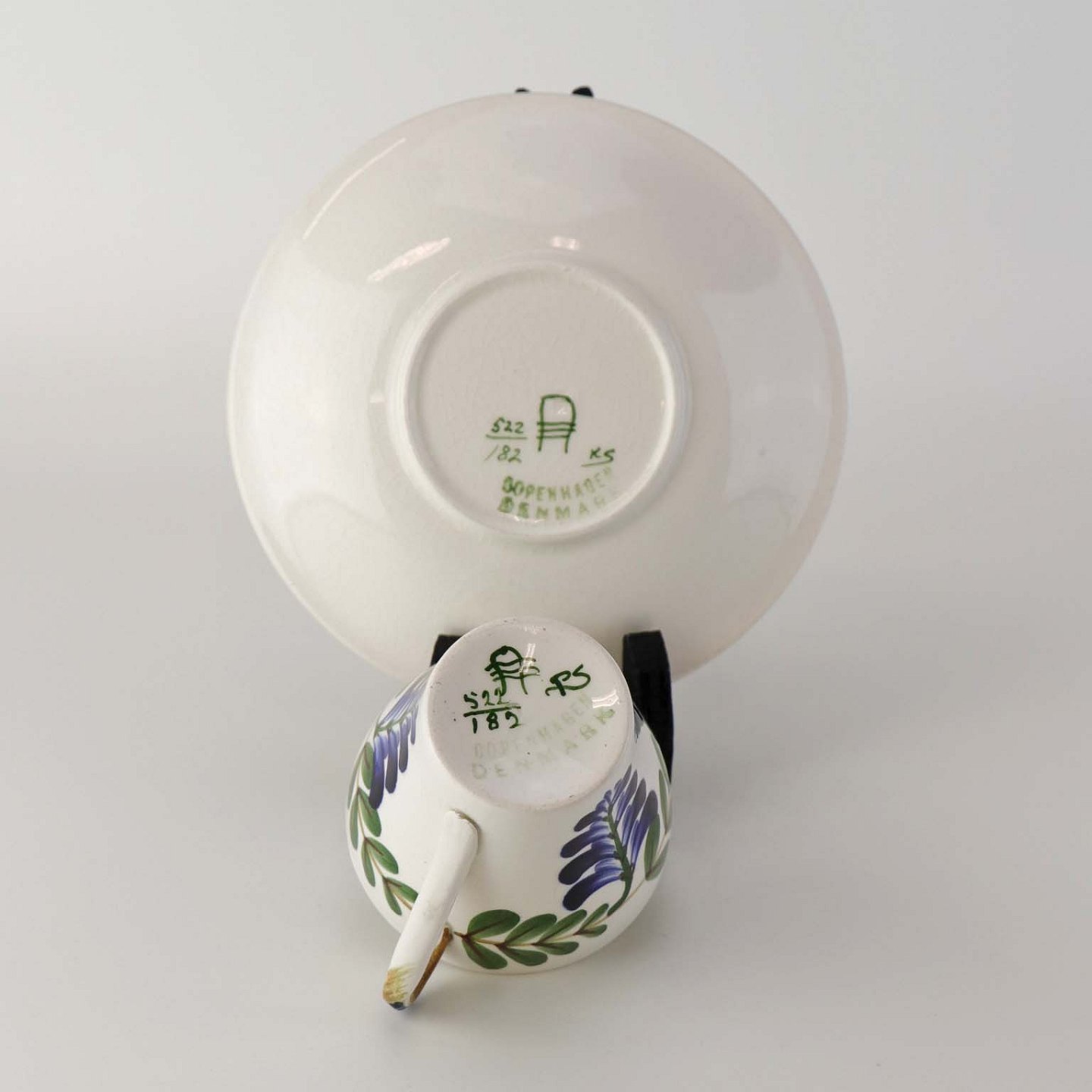 Lille kaffe eller moccakop med underkop i fajance fra stellet Blåregn. Stellet er fremstillet i perioden år 1903-1933. Nr. 522/182