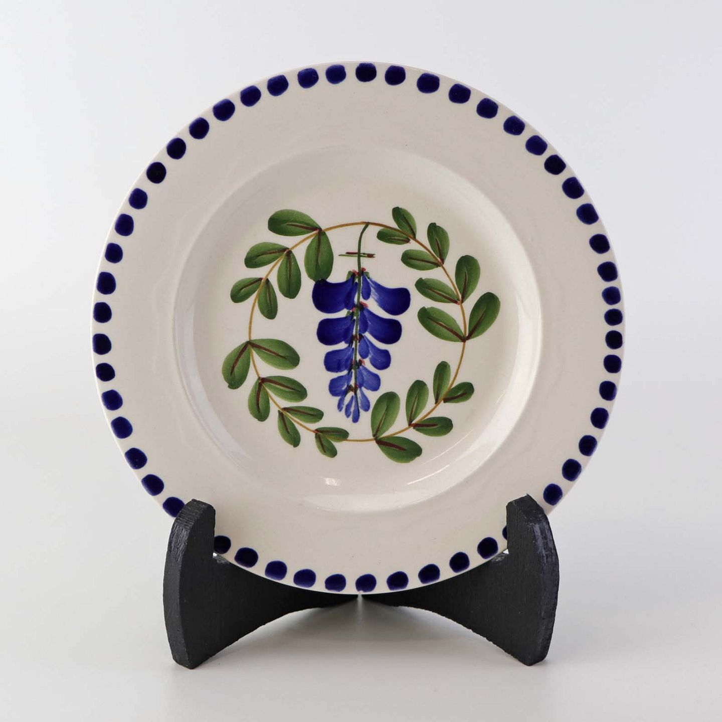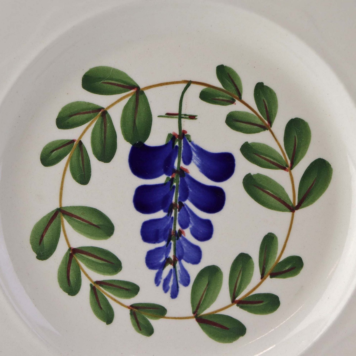 Fajancestel med dekoration af ranker af blåregn og blade på lys baggrund afsluttet med kant af runde blå pletter.