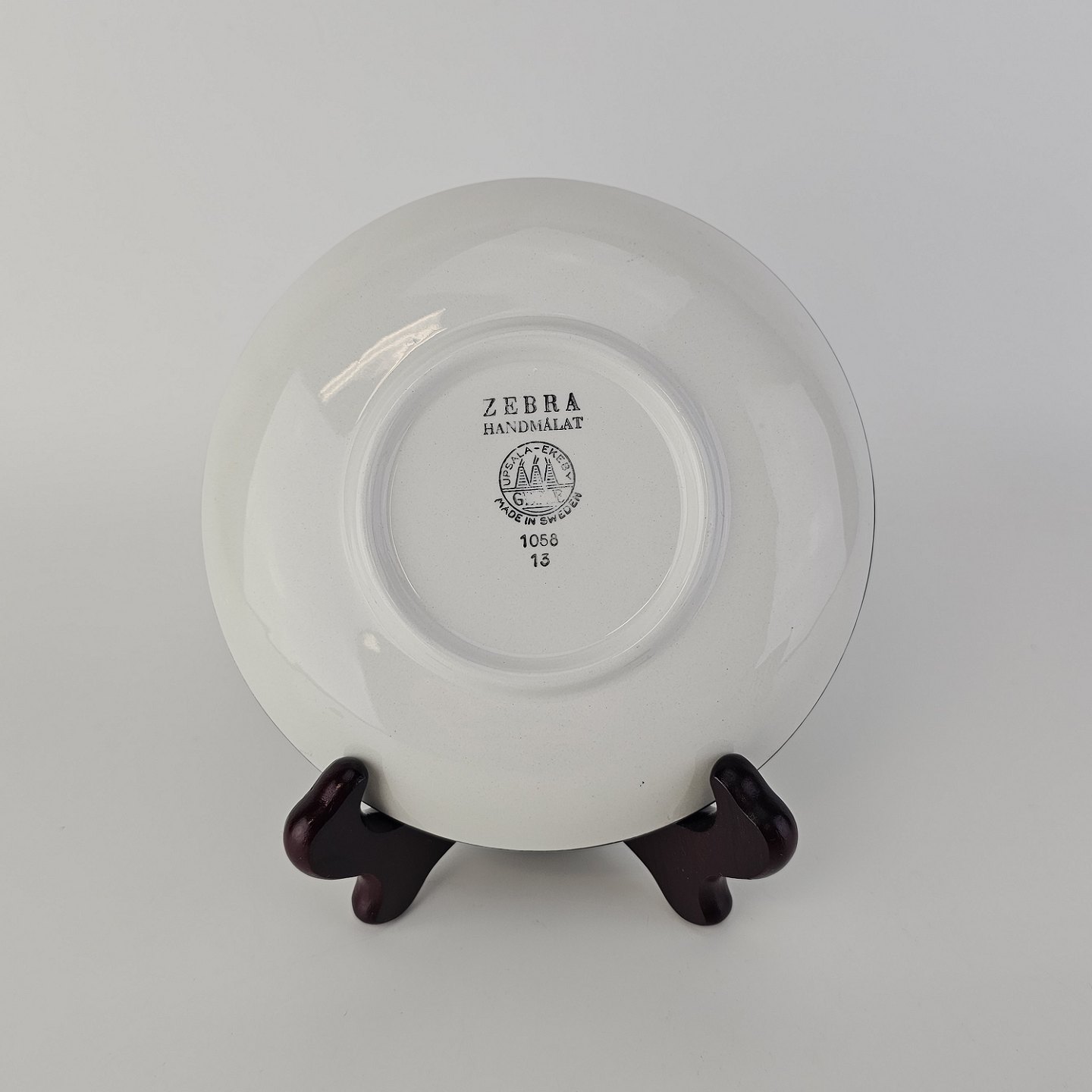 Håndmalet kop med underkop i fajance fra stellet Zebra med mønster i sorte og hvide striber.