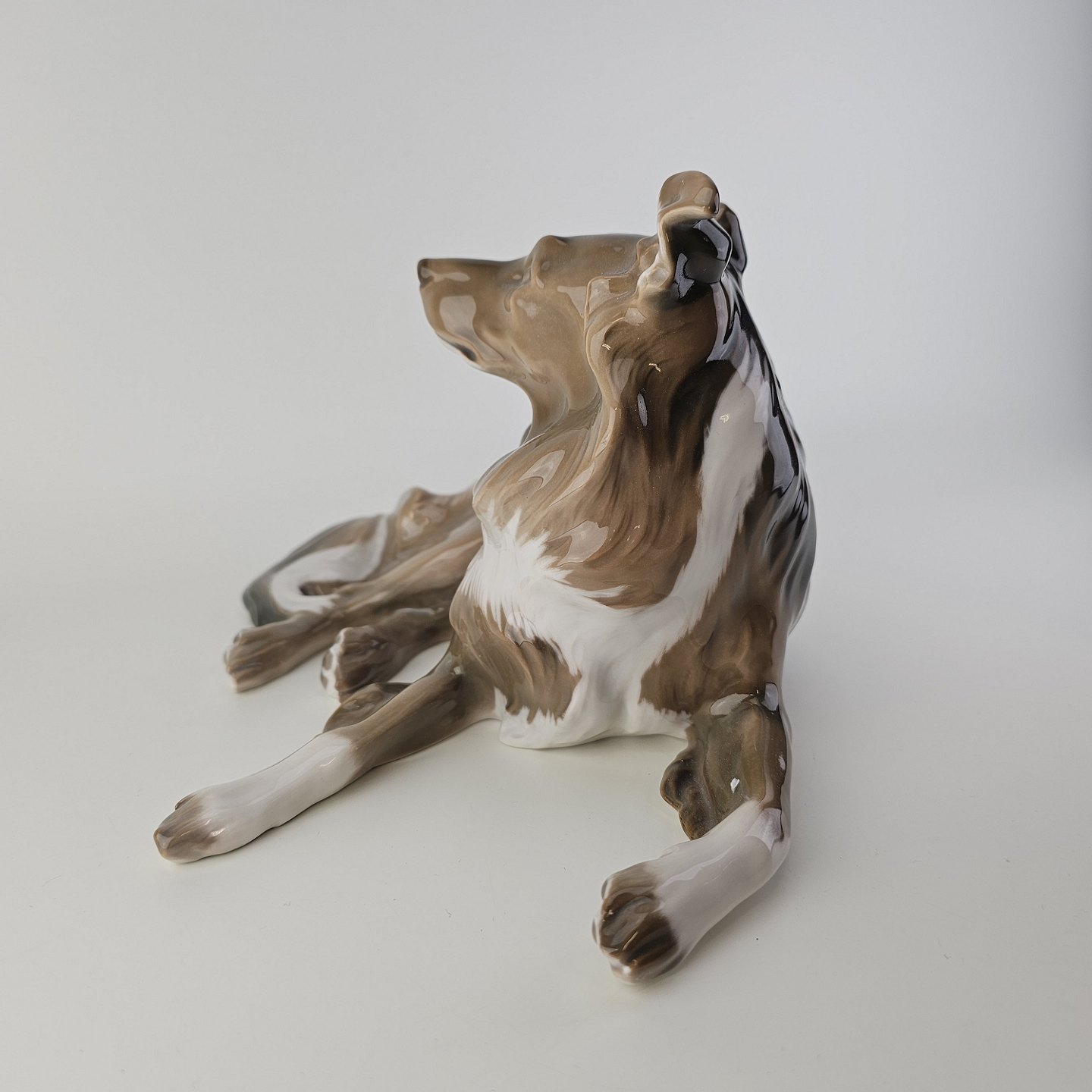 Figur i hvidt porcelæn med motiv af en liggende hund.