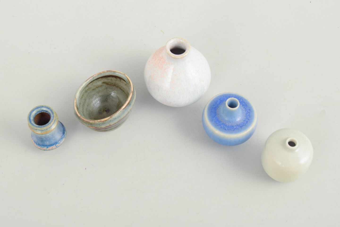 Sæt af fem miniature skåle og vaser i keramik.