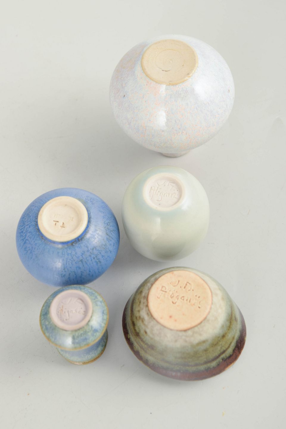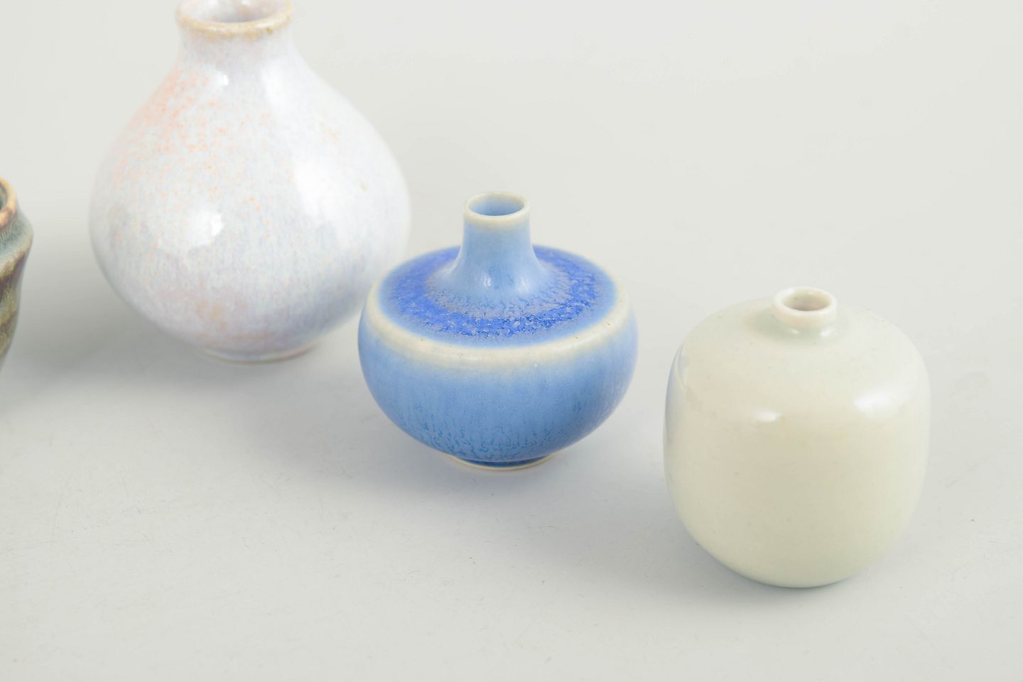 Samling af fem miniature keramikgenstande bestående af små skåle og vaser i forskellige former og glasurer. Fremstillet i keramik med flerfarvede glasurer i blå, grønne og lyse nuancer. Tre eksemplarer er fra Höganäs og andre fra forskellige producenter, herunder et umærket eksemplar.
