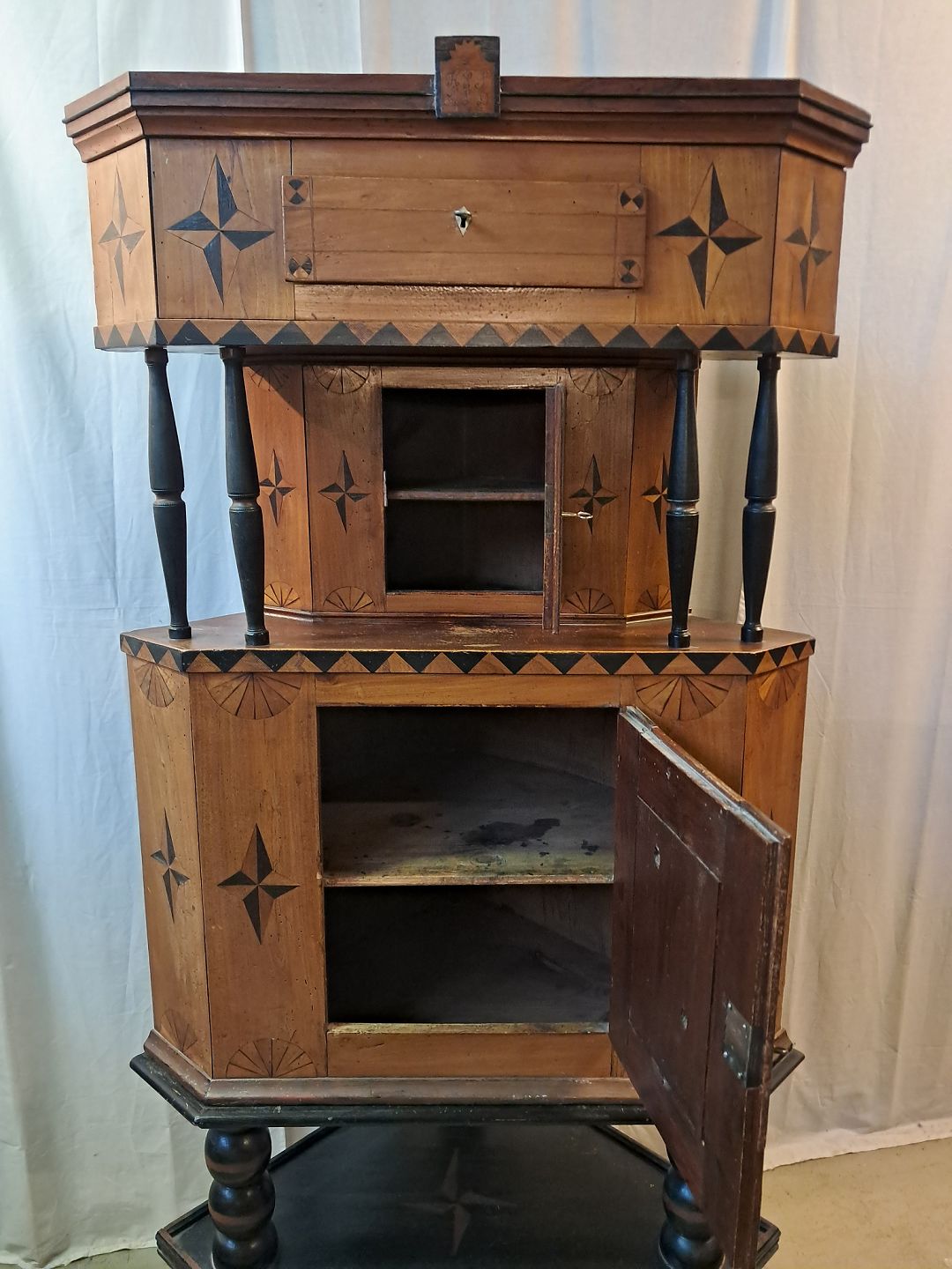 Hjørneskab i ege og elmetræ, det har 200 års jubilæum