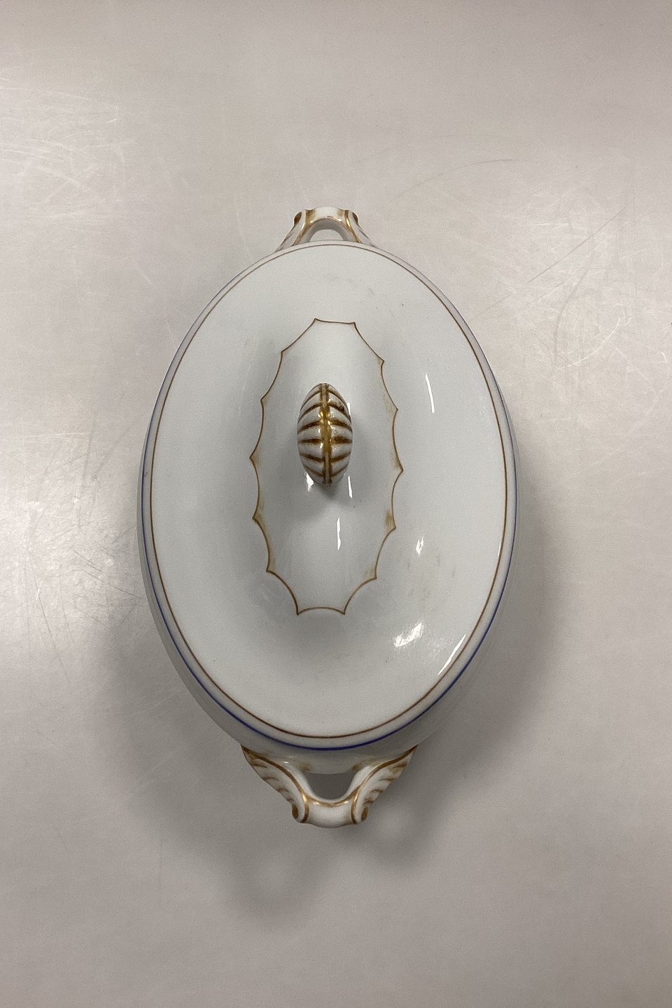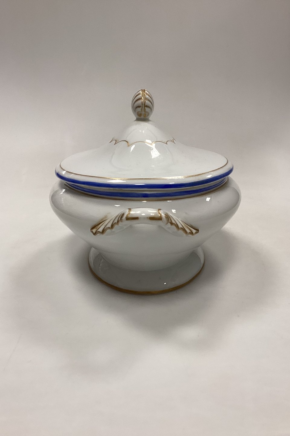 Royal Copenhagen Terrin med Underfad No. 282/9058. Hvidt porcelæn med dekoration i guld og koboltblå. Lettere slid på guld og kanter.