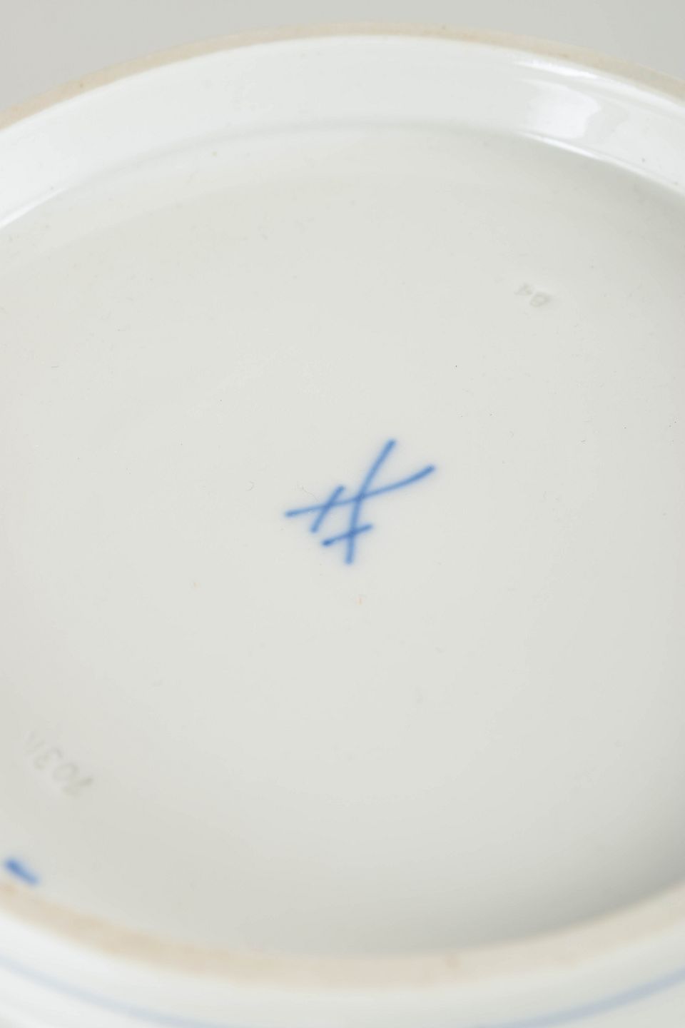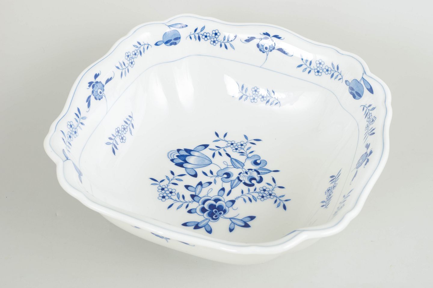 Stor skål i håndmalet porcelæn med Blå Orkidé dekoration. Fremstillet hos Meissen og mærket med Meissens krydssværd. Annulleret med to indridsede streger under bunden.