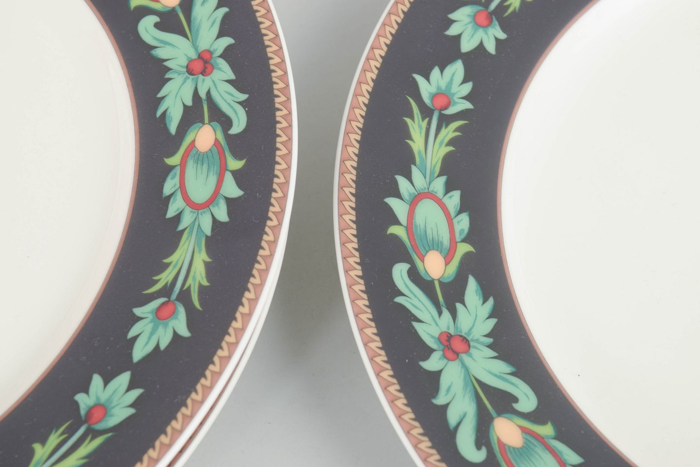 Sæt af tre middagstallerkener i porcelæn med dekorativ bort i grønne og gyldne nuancer mod mørk baggrund. Tallerkenerne er fremstillet hos Rosenthal efter design af Nina Campbell.