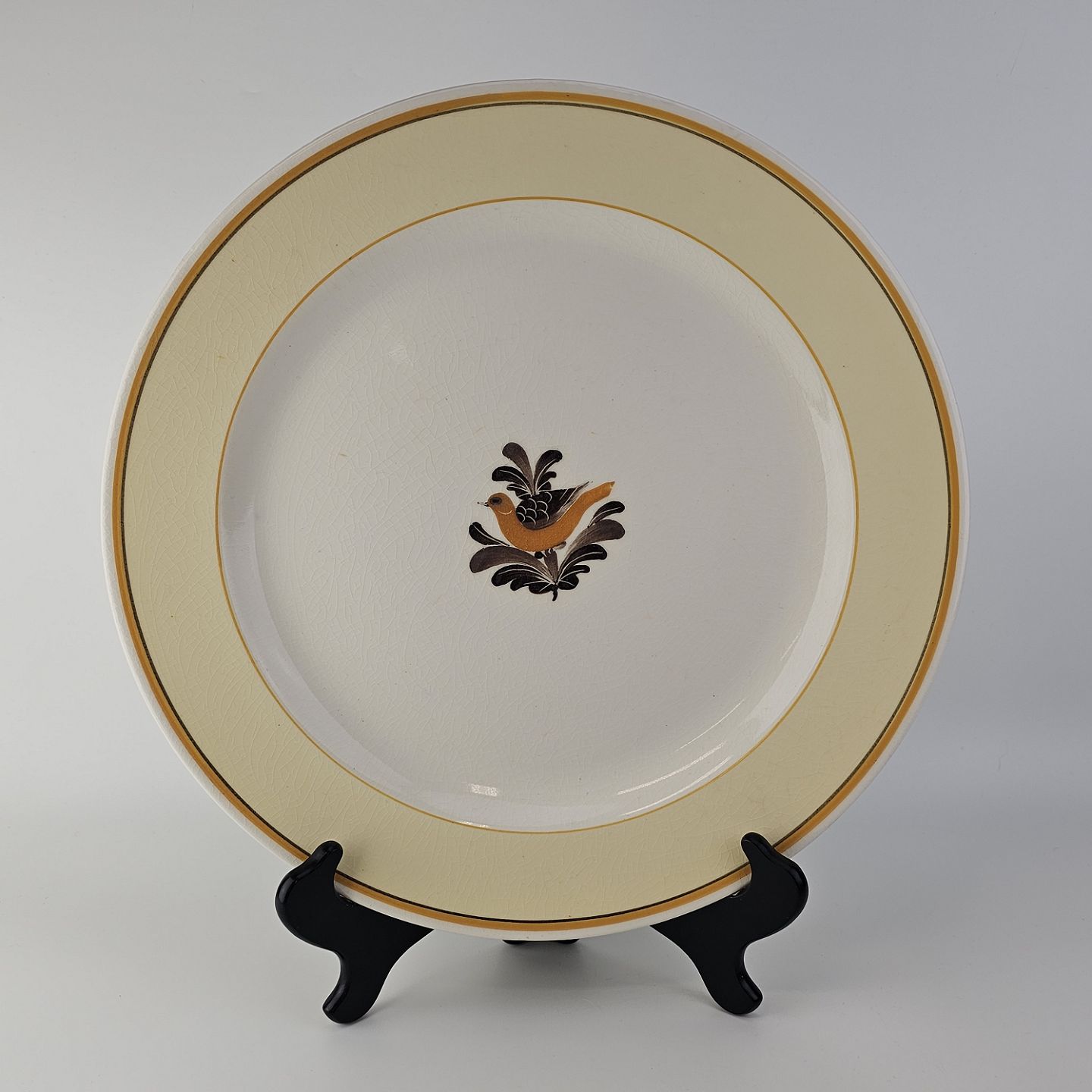 Hvidt fajancestel i stelform G med motiv af en orange og brun fugl og kant.