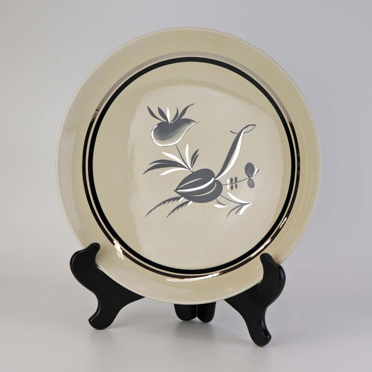 Råhvidt fajancestel i stelform E med dekoration af naturmotiver i sølv og sort farve.