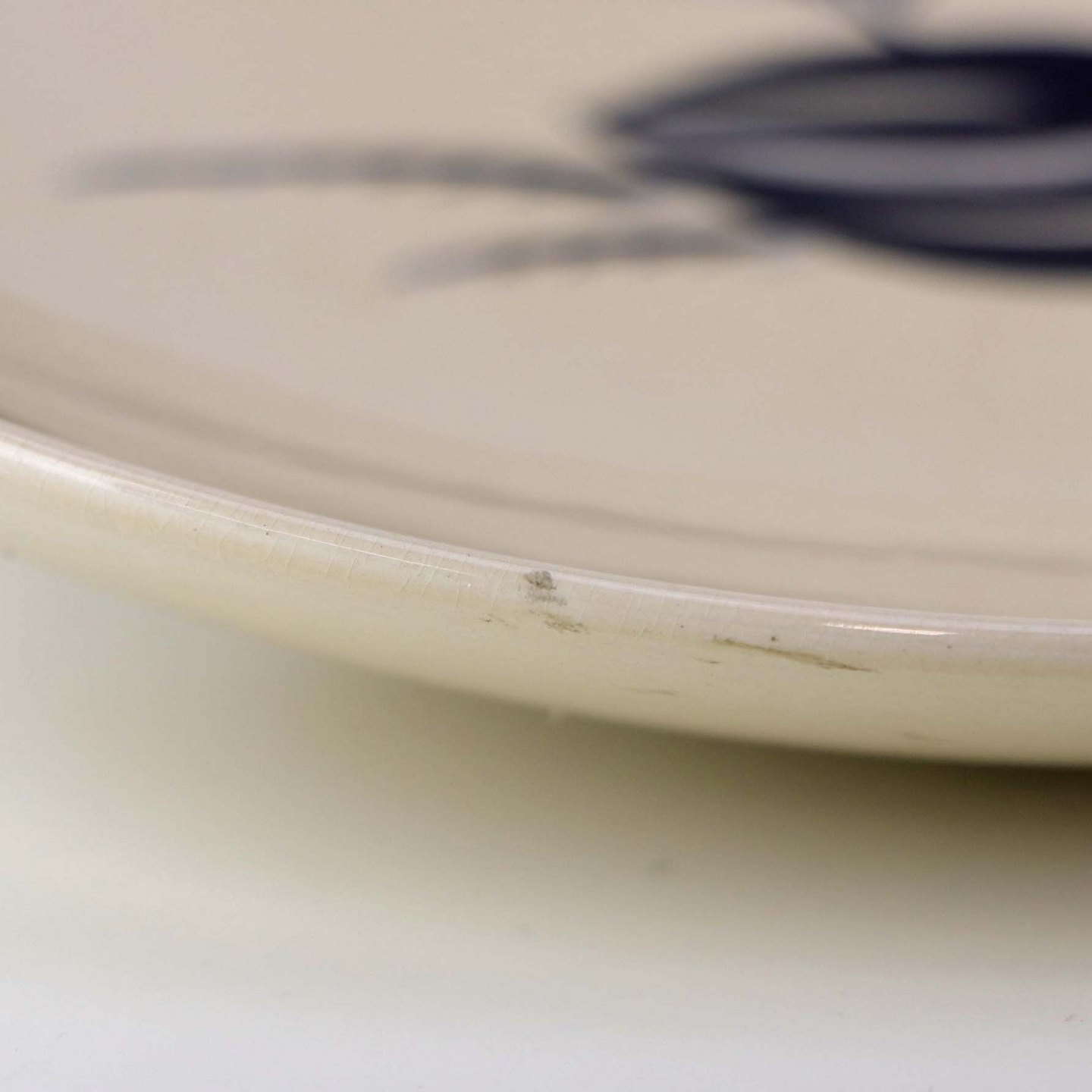 Fremstår med ujævnhed i støbningen, brugsspor på dekorationen samt ujævnheder i glasuren.