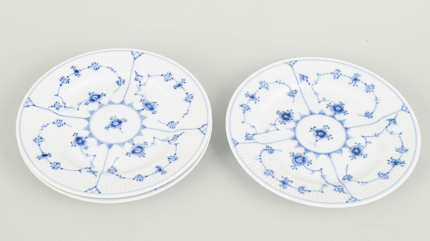 Royal Copenhagen Musselmalet Riflet, sæt af tre kagetallerkener.