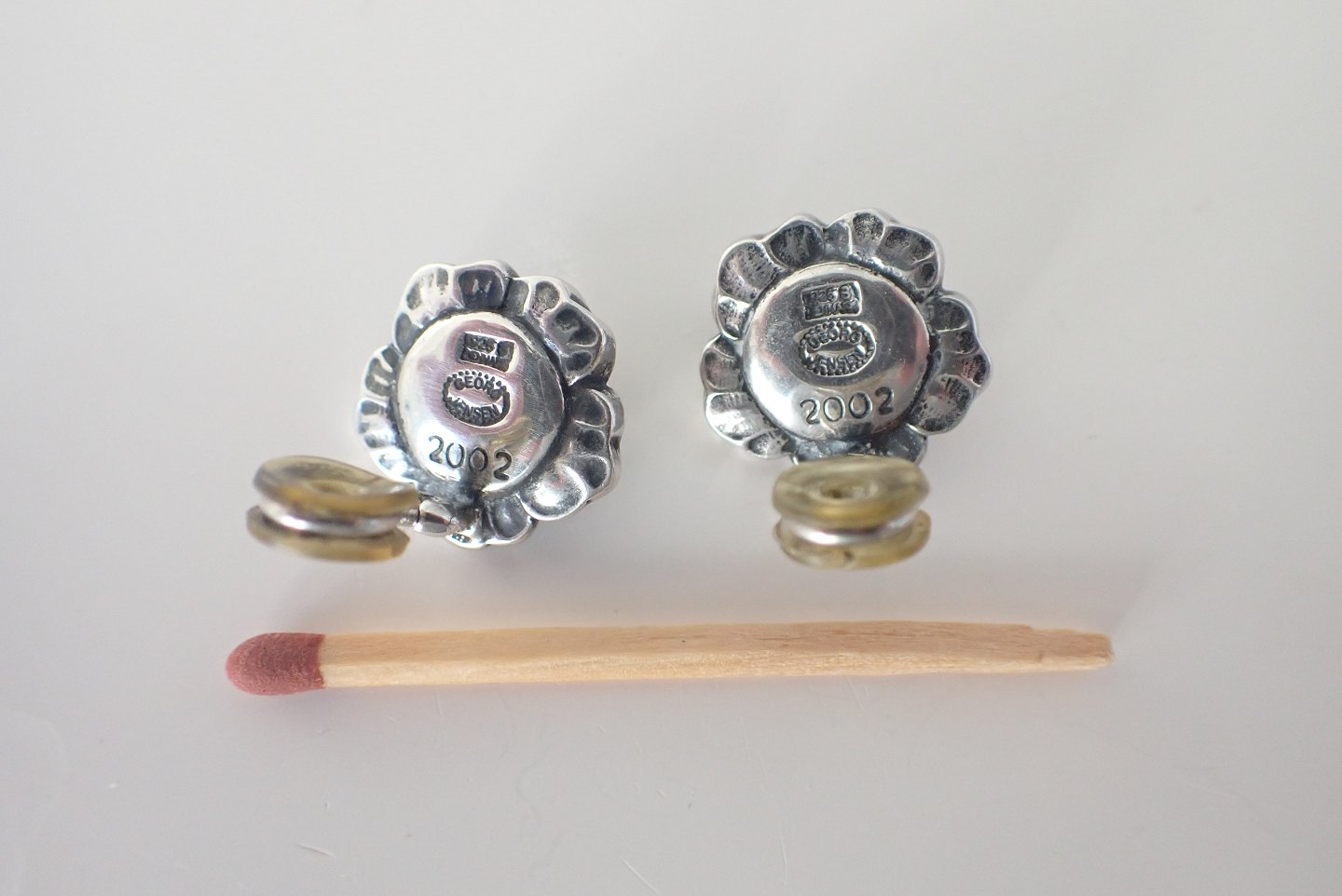 Georg Jensen årssmykke 2002 - blomsterøreklips i sterling sølv med en cabochonsleben granat i hver. Stemplet Georg Jensen, 2002, 925.s Denmark. Med gummipropper i clips. Samlet vægt: 11 gram. Diameter på blomst: 1,8 cm. I fin stand.