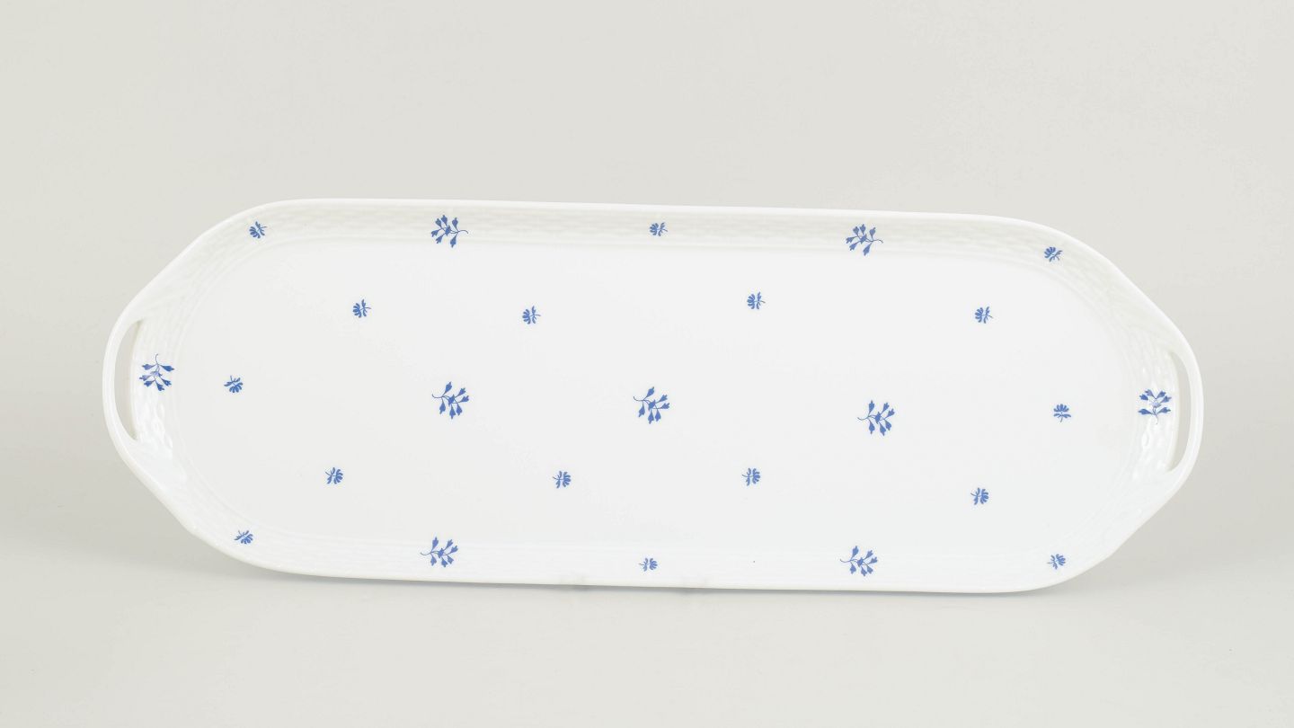 Imponerende og elegant ovalt porcelænsfad fra Herend, udført med raffineret håndmalet dekoration og fin forgyldning langs randen. Fadet fremstår med klassisk proportionering og balanceret form, typisk for fabrikkens produktion i mellemkrigstiden. Et repræsentativt og dekorativt serveringsfad fra 1930’erne.