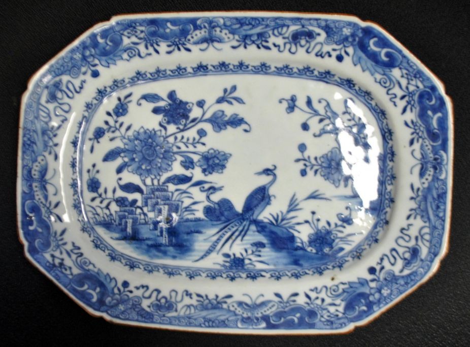 Kinesisk blådekoreret 8 kantet fad, ca. 1780. Kangxhi. Dekoreret med landskab, fugle og blomster. Ustemplet. L.: 31,5 cm. B.: 23 cm.