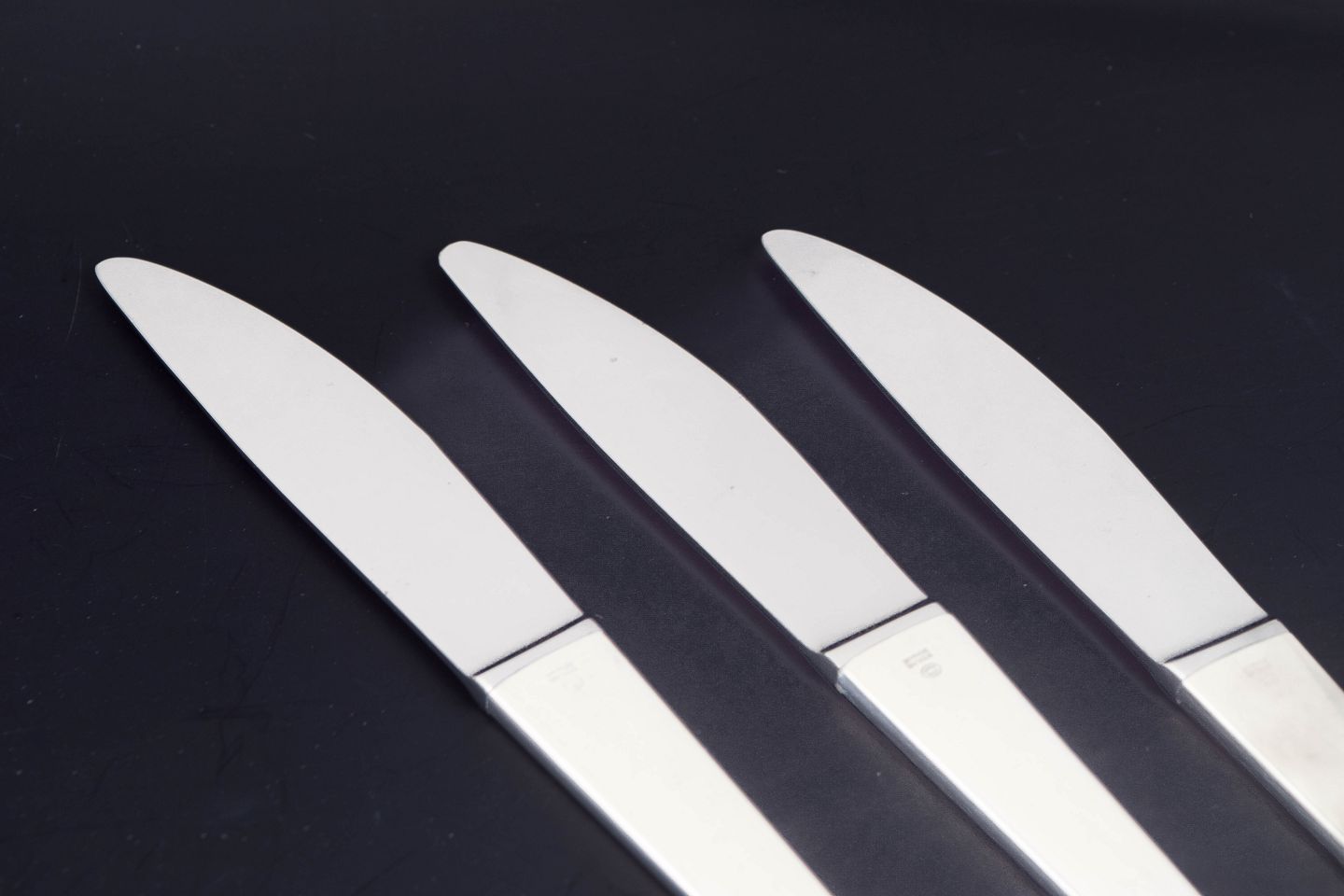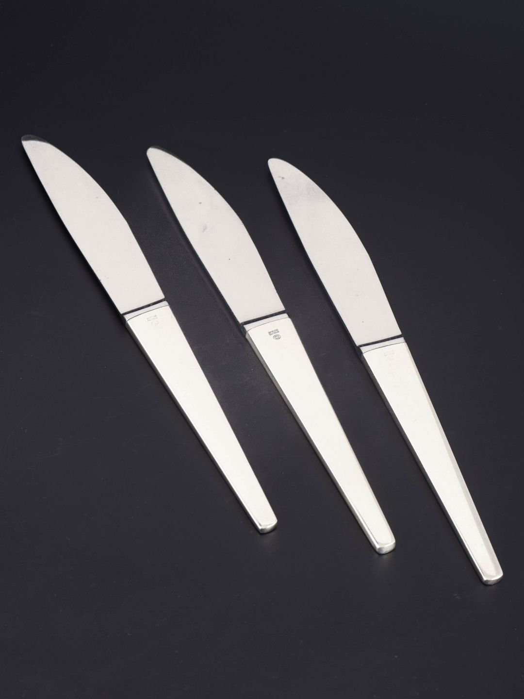 Tre middagsknive i rustfrit stål og sterlingsølv i modellen Caravel, designet af Henning Koppel for Georg Jensen. Bestikket er udført i et stramt og moderne formsprog med slanke linjer og en let konisk form, karakteristisk for Koppels funktionalistiske design.