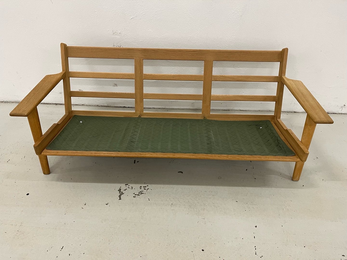 Sofaen er for nylig gennemgribende renoveret med stor respekt for det originale design og materialernes kvalitet. Renoveringen omfatter blandt andet nye fjedre, nye hynder samt ny polstring i uldstof. Stellet i egetræ er nænsomt renset og efterfølgende sæbebehandlet, hvilket fremhæver træets naturlige struktur og giver et smukt, velplejet udtryk.
