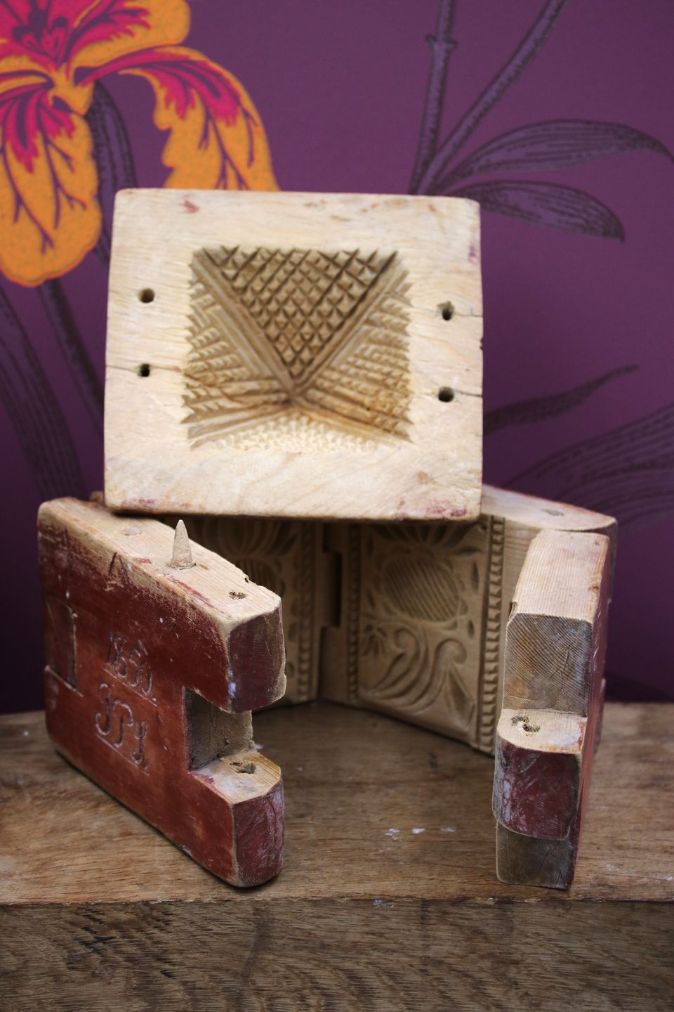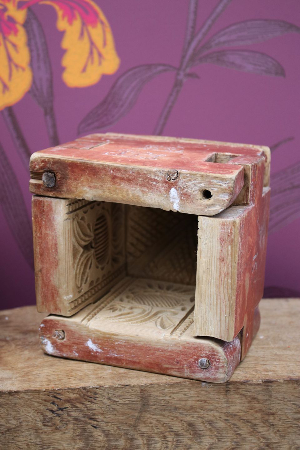 Sjælden , antik svensk 1800 tals smørform i træ med original farve.