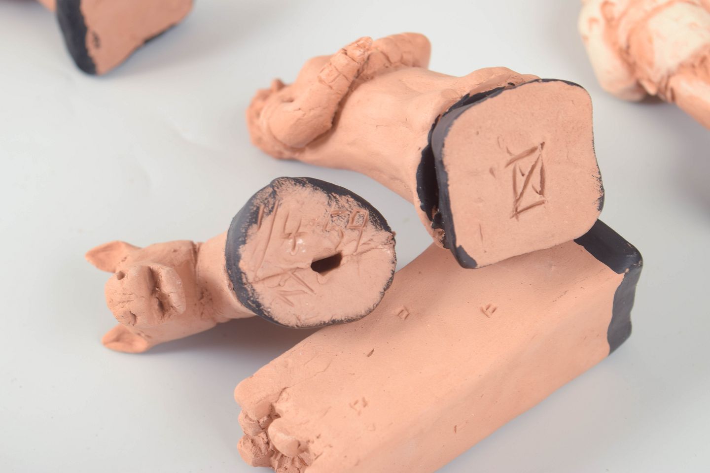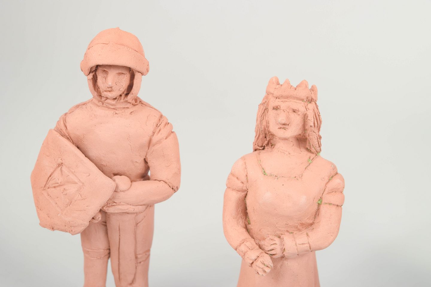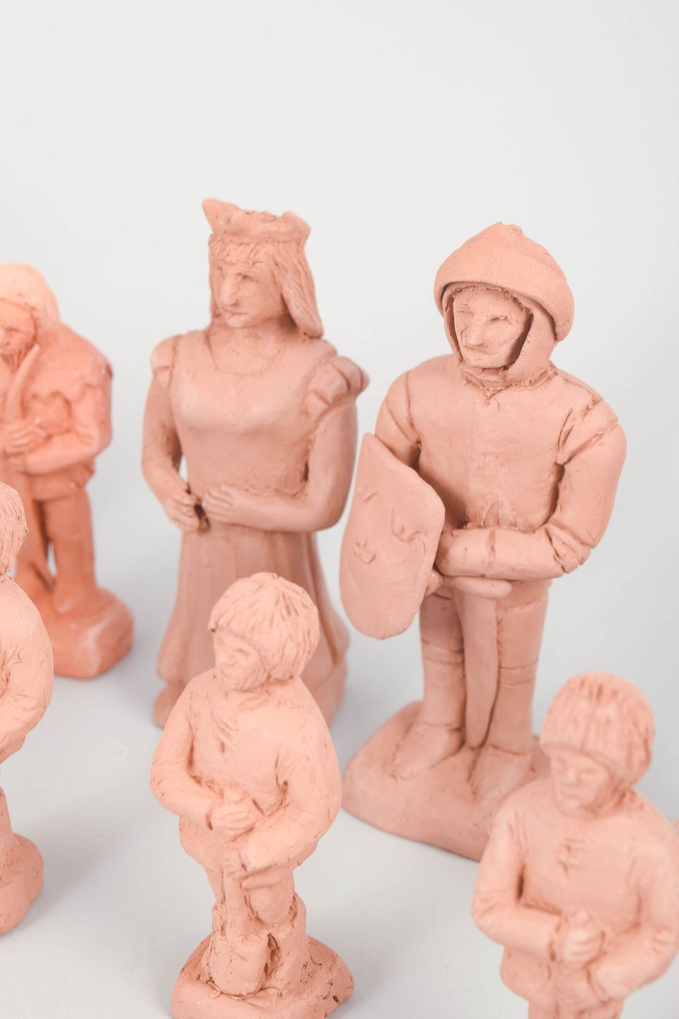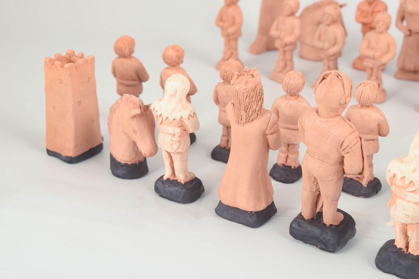 Unikt keramisk skaksæt bestående af toogtredive håndmodellerede figurer udført i uglaseret ler. Figurerne er udformet som stiliserede menneskefigurer og skulpturelle former, hver med individuelle karaktertræk og detaljer. Flere af figurerne er signerede. Sættet fremstår som et kunstnerisk fortolket skakspil med tydelig skulpturel karakter. Fremstillet i 1959.