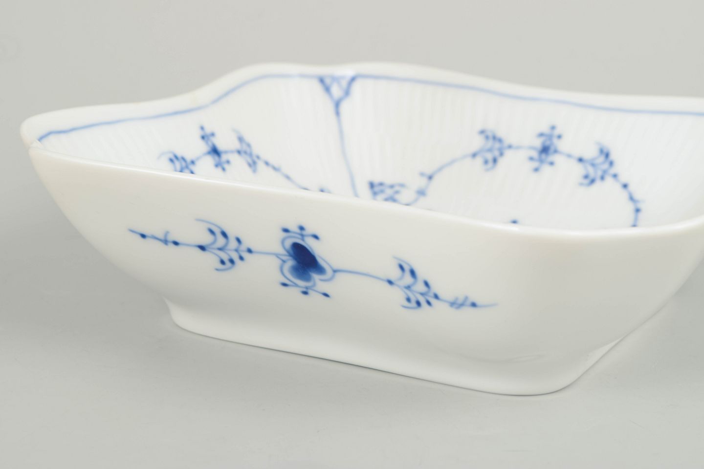 Håndmalet porcelænsskål dekoreret med det klassiske musselmalede riflet mønster i blå underglasur. Skålen har en elegant firkantet form med let svungne sider og riflede detaljer i godset. Centralt ses det karakteristiske blomsterornament omgivet af slyngede blomstergrene. Undersiden er fabriksstemplet Royal Copenhagen, første sortering. Model 1/26.