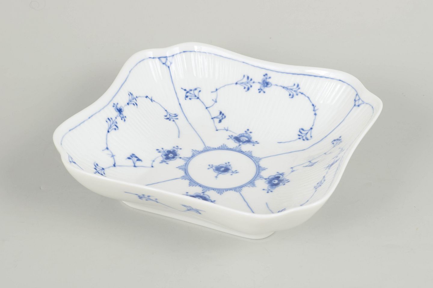 Håndmalet firkantet skål i porcelæn dekoreret med det klassiske musselmalede riflet mønster i blå underglasur. Skålen har svagt buede sider med riflede detaljer og et centralt blomsterornament omgivet af slyngede blomstergrene. Undersiden er fabriksstemplet Royal Copenhagen og annulleret med én indridset streg gennem fabriksstemplet. Model 1/26.