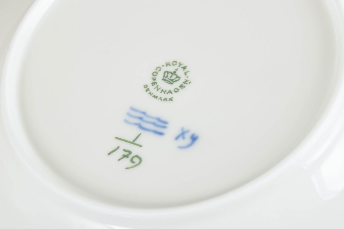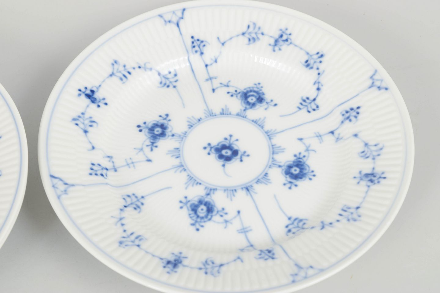 Sæt af tre håndmalede porcelænstallerkener dekoreret med det klassiske musselmalede riflet mønster i blå underglasur. Tallerkenerne har riflet fane og centralt blomsterornament omgivet af slyngede blomstergrene, et karakteristisk træk ved serien. Undersiden er fabriksstemplet Royal Copenhagen, første sortering. Model 1/179.