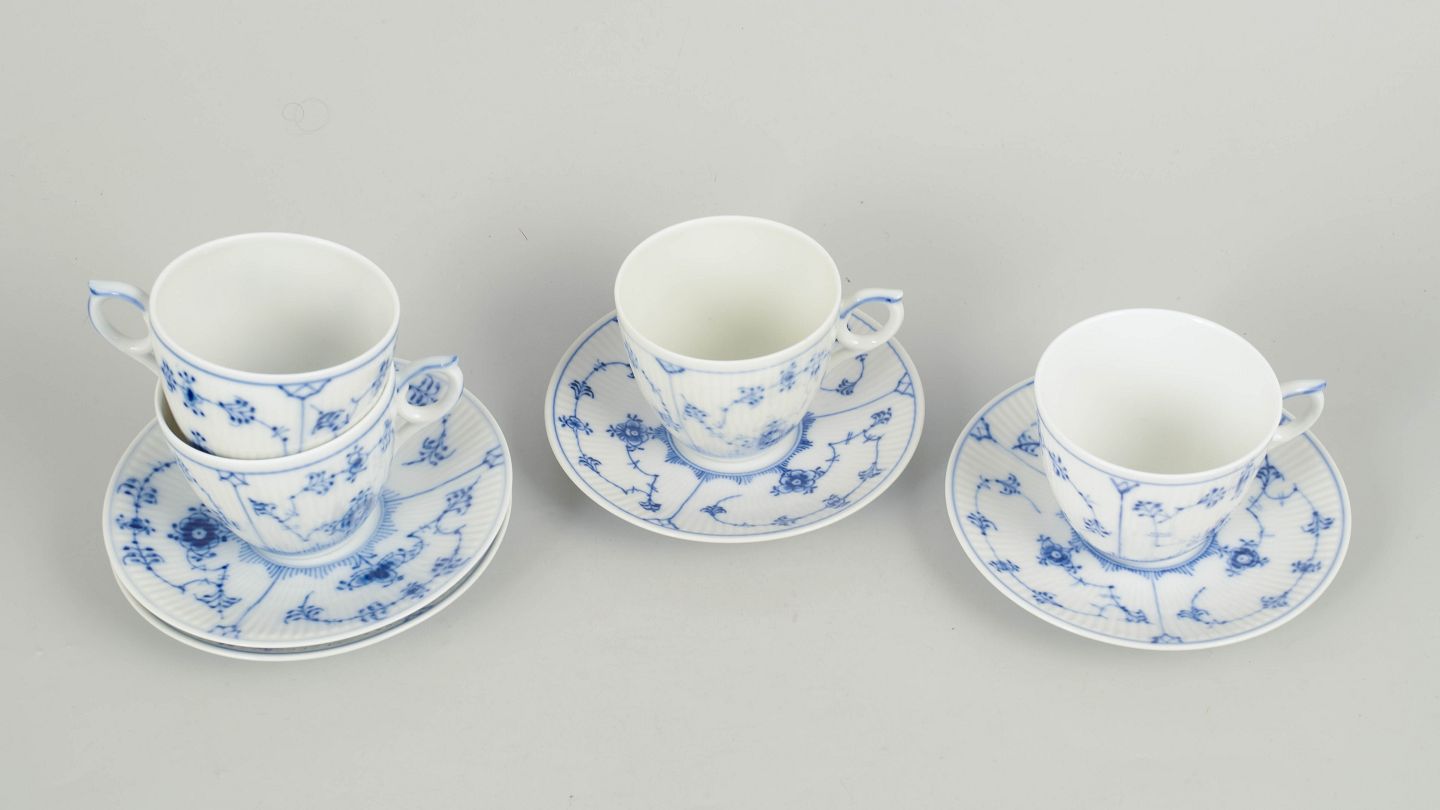 Royal Copenhagen Musselmalet Riflet, sæt af fire kaffekopper med underkopper.
