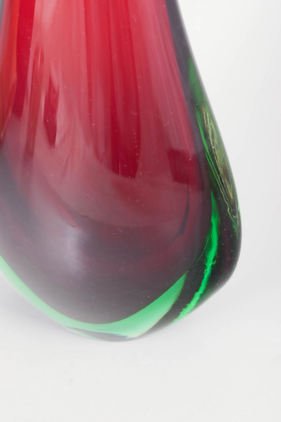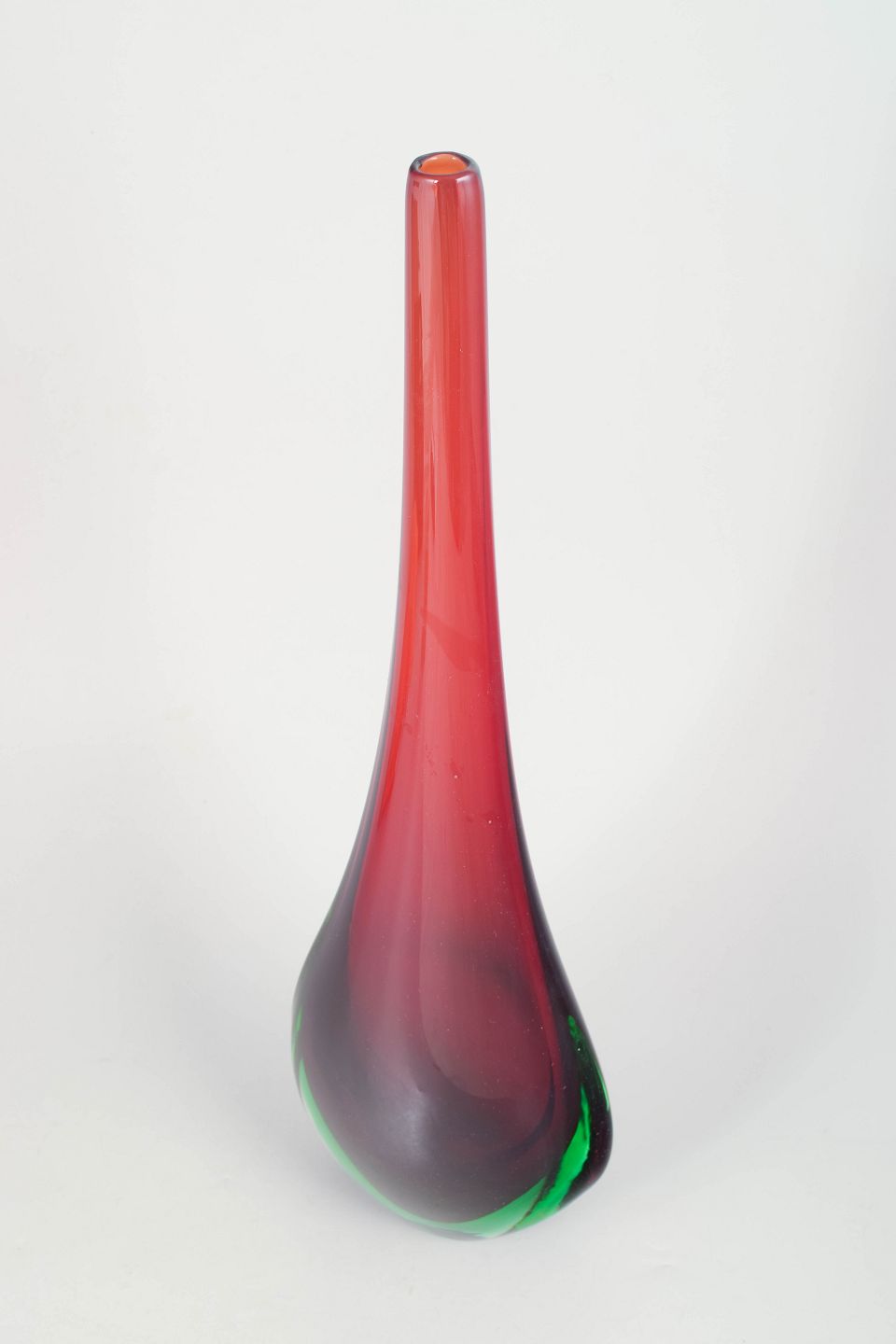 Elegant kunstglasvase i klart glas med indkapslet rød kerne og grøn tone i bunden samt meget lang slank hals, udført i karakteristisk Murano-stil med skulpturel dråbeform.