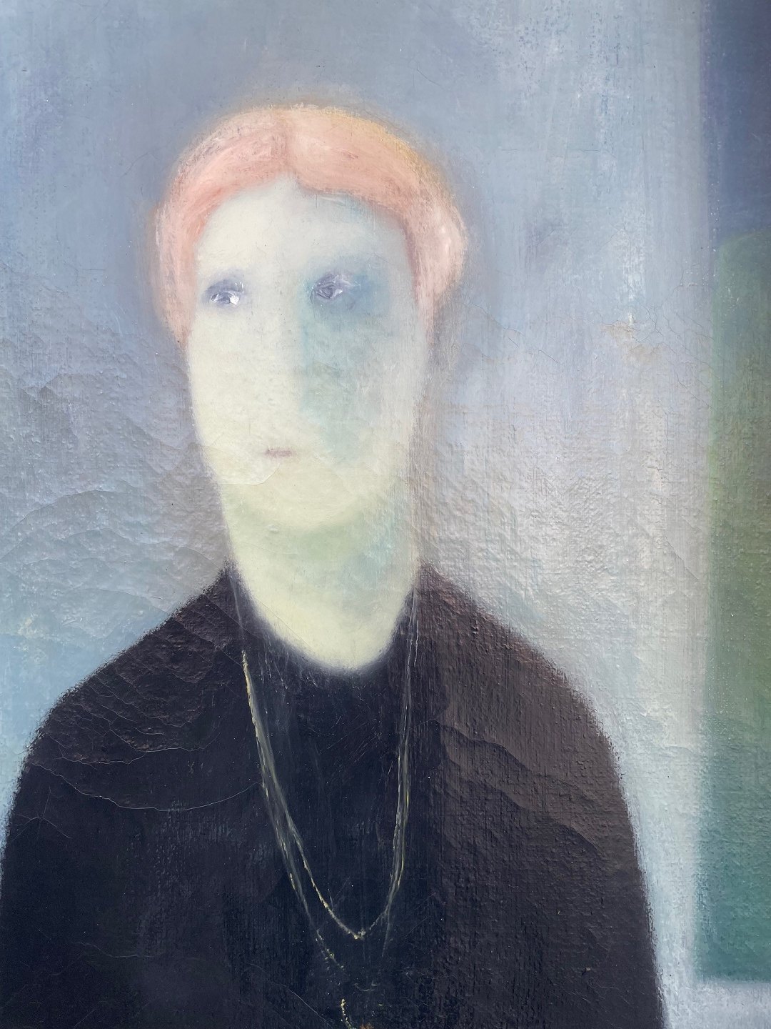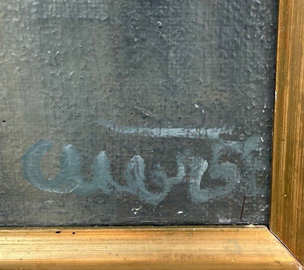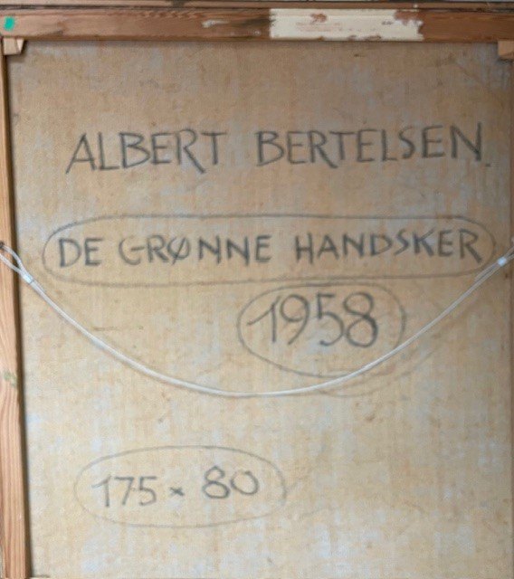"De grønne handsker" Olie maleri på lærred i forgyldt ramme. Maleriet har været udstillet, har krakeleringer fordelt over hele maleriet.