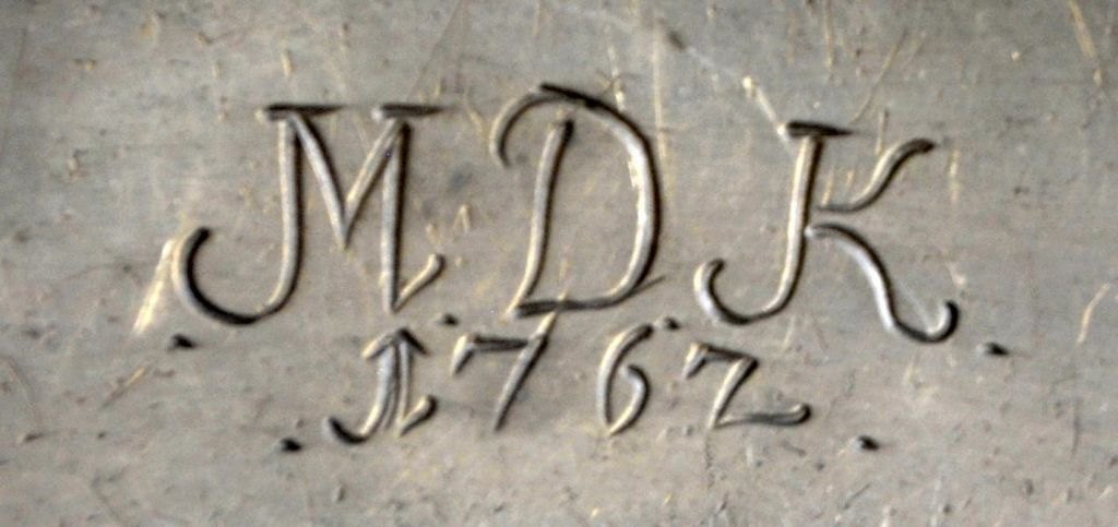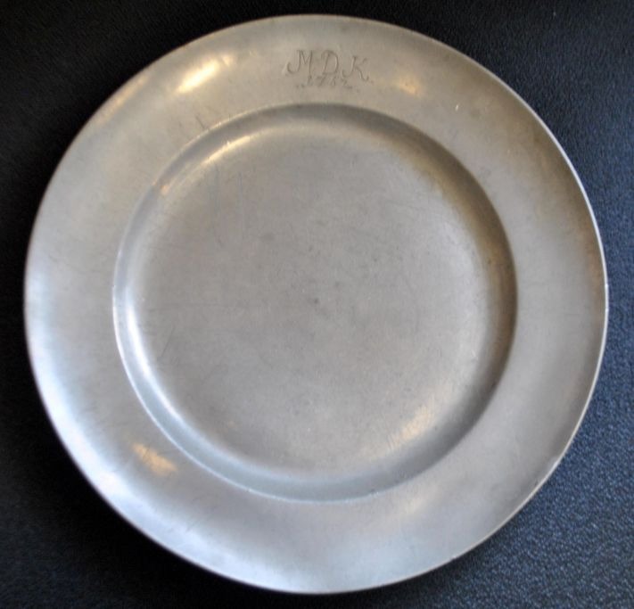 Tin tallerken, 1708, Tyskland. Indgraveret: MDK 1767. Stemplet: ICW 1708. Dia: 24 cm.