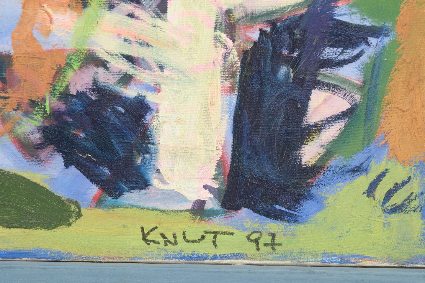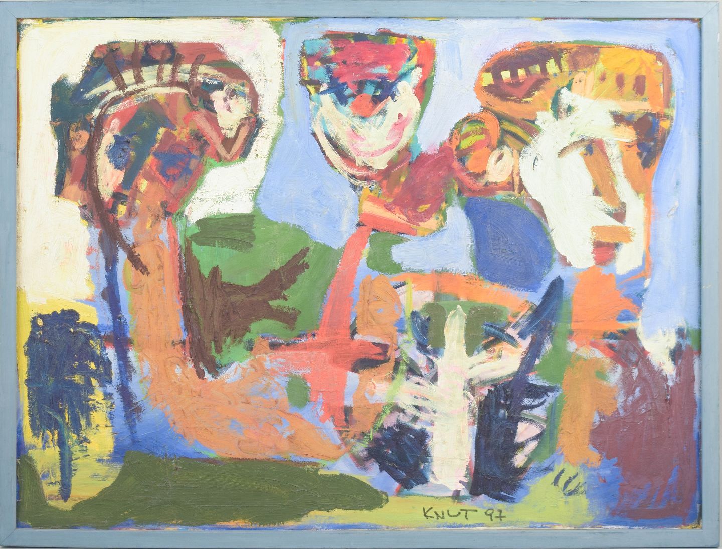 Abstrakt ekspressionistisk maleri i Cobra-stil, signeret Knut 1997. Skandinavisk kunstner.