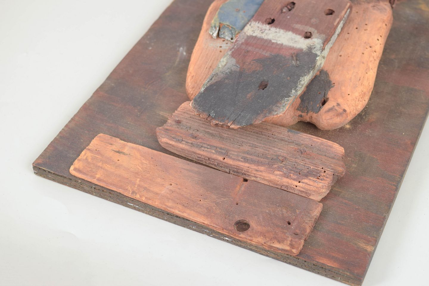 Abstrakt vægrelief udført som collage af forskellige træstykker monteret på træplade. Kompositionen består af drivtømmer-lignende fragmenter og groft bearbejdede træelementer med tydelige naturlige strukturer, patina og spor efter alder.