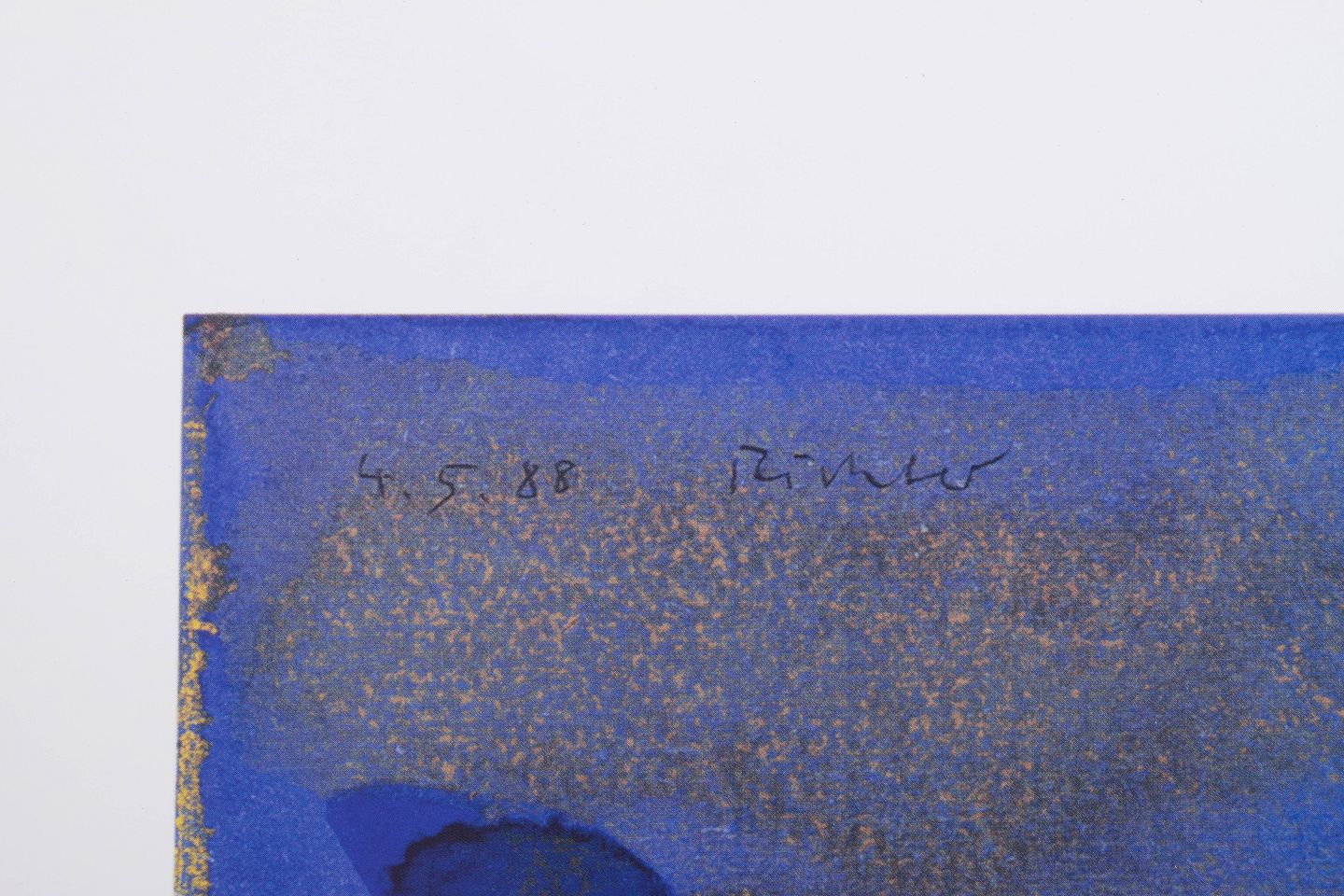 Abstrakt komposition udført som farvetryk i bløde overgange af blå, rosa, gule og beige toner. Signeret i trykket og dateret 1988.
