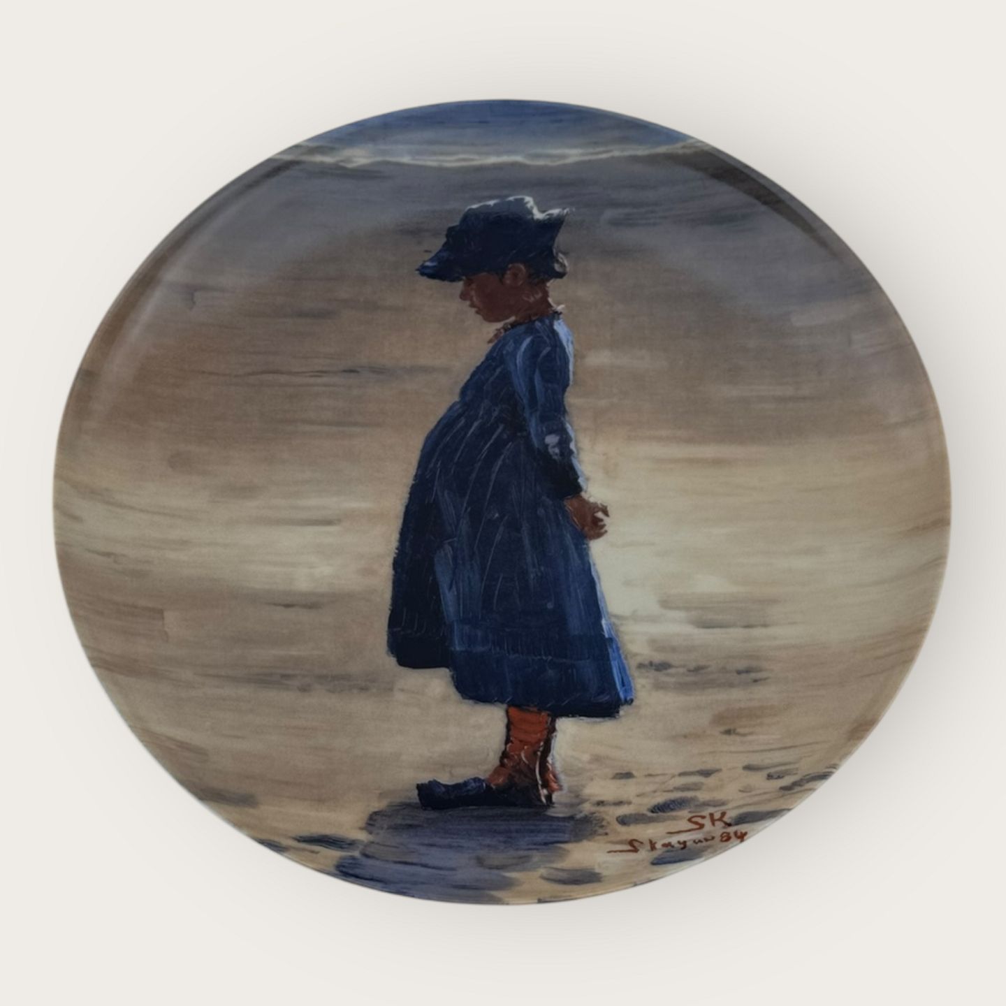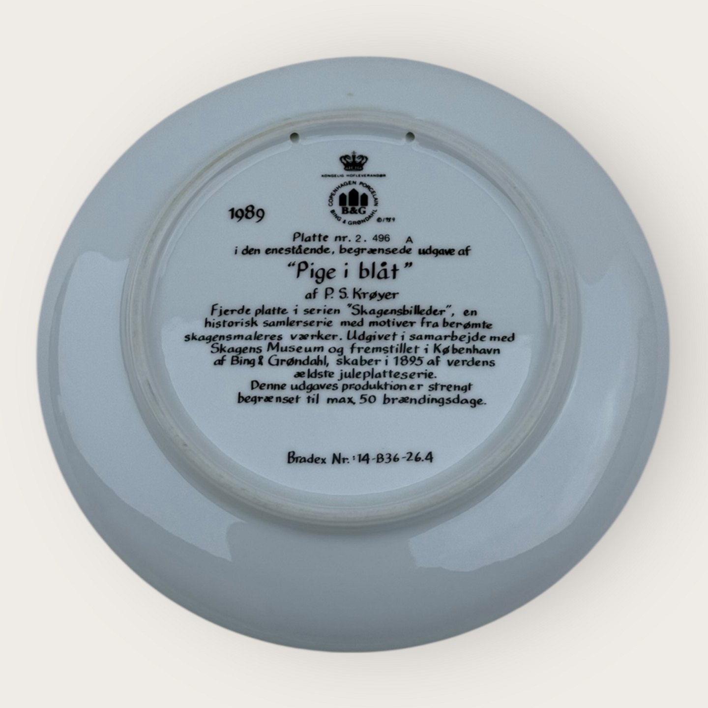 Bing & Grøndahl, Skagensmalerne, 1986, Platte nr. 2, # 496A, “Pige i Blåt” P.S. Krøyer, 21cm i diameter *Perfekt stand*
