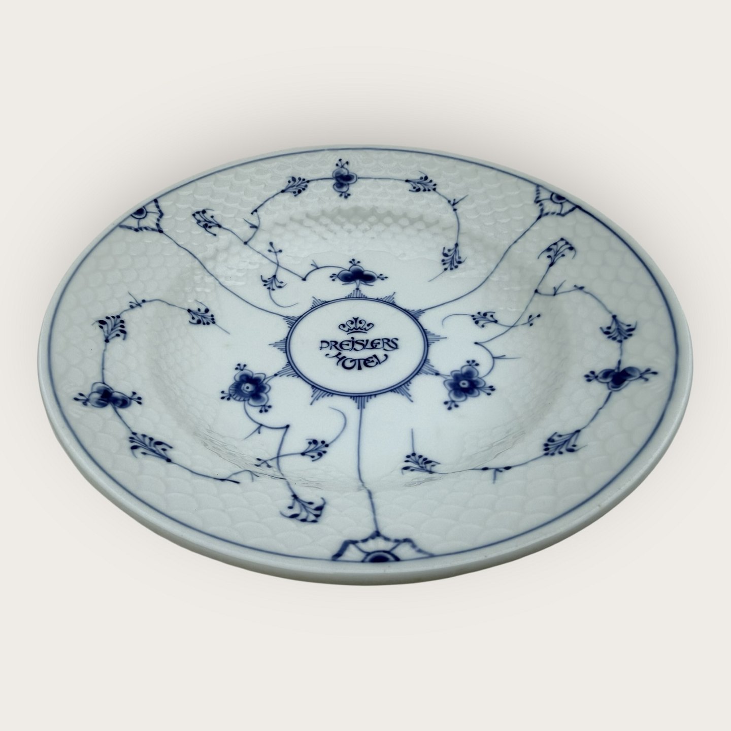 Bing & Grøndahl, Blå malet (Musselmalet), #1008, stor dyb tallerken i hotelporcelæn ( Jernporcelæn ) med logo fra Preislers Hotel, 25cm i diameter, 1. sortering * Pæn stand*