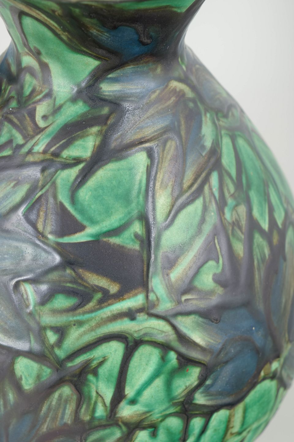 Stor vase i glaseret lertøj med balusterform og smal hals. Udført i den karakteristiske kohornsglasur med dybe grønne, blå og mørke nuancer, hvor glasuren flyder i organiske mønstre og skaber et dramatisk og levende overfladespil.