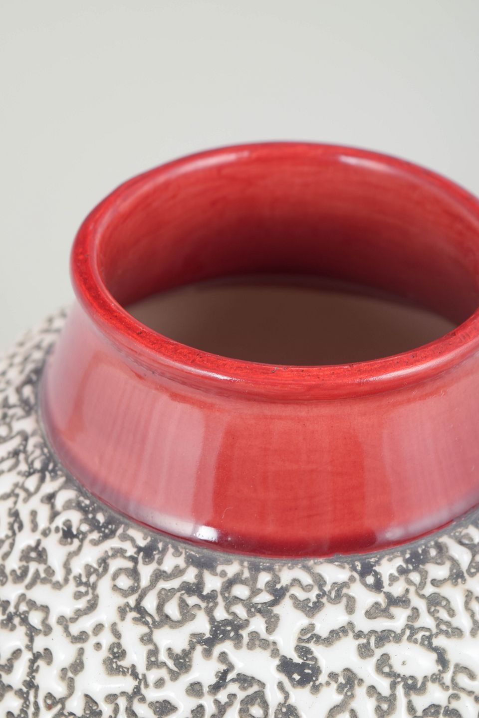 Art Deco-vase i keramik med balusterform, dekoreret med tæt sort abstrakt mønster på hvid bund samt pinkrød glasur på hals og fod. Signeret.