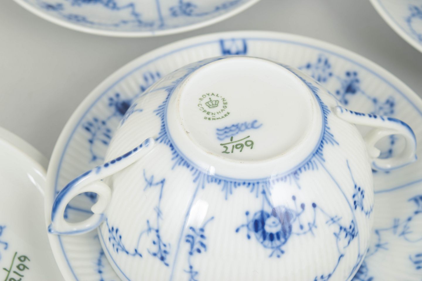 Royal Copenhagen, musselmalet riflet sæt af fire bouillonkopper med underkopper.