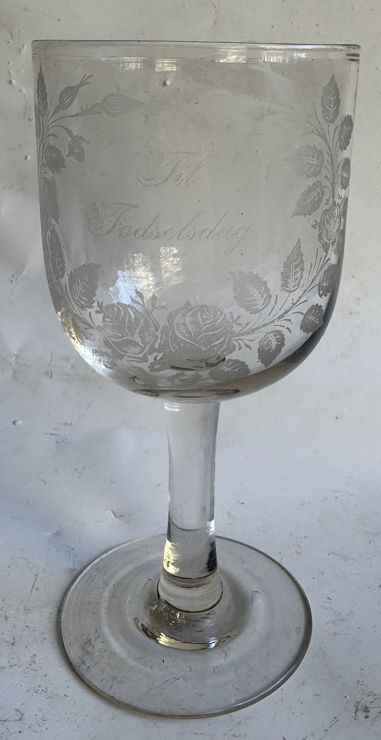 Gammelt dansk vin glas fra Kastrup Glasværk i form af erindringsglas fra ca. 1910. Fremstår i god stand uden skader eller reparationer med teksten: "Til Fødselsdag". H. 16 cm