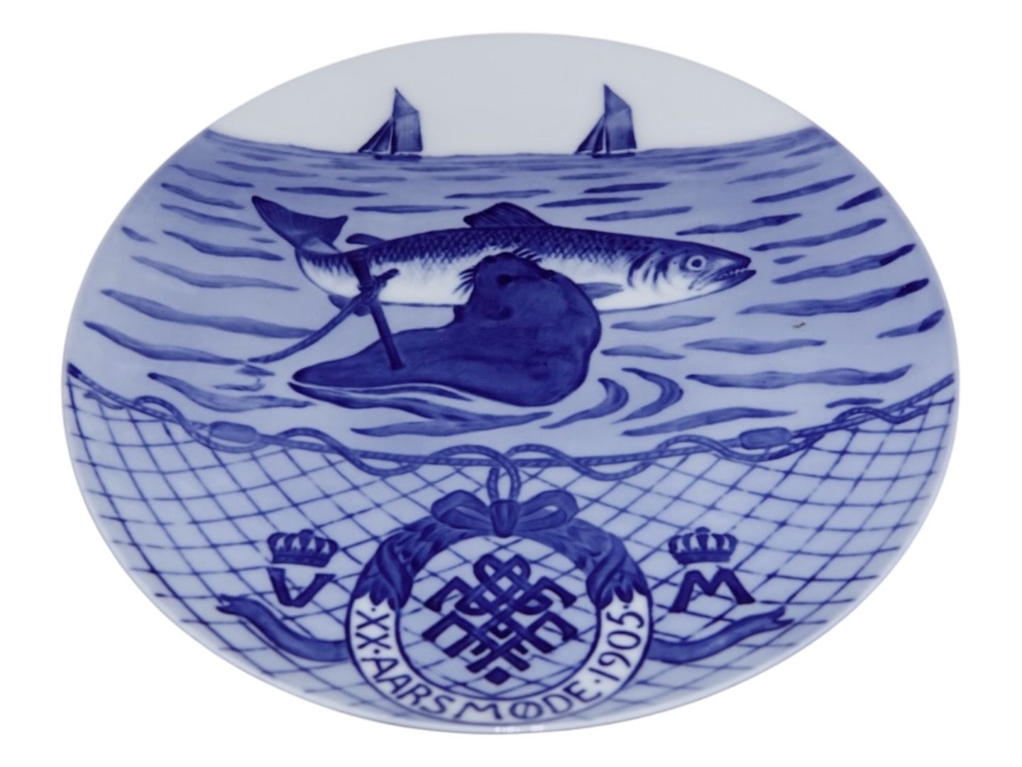 Royal Copenhagen Mindeplatte fra 1905 dekoreret med en sæl med en laks i munden i anledning af Årsmøde i Fiskeriforeningen.