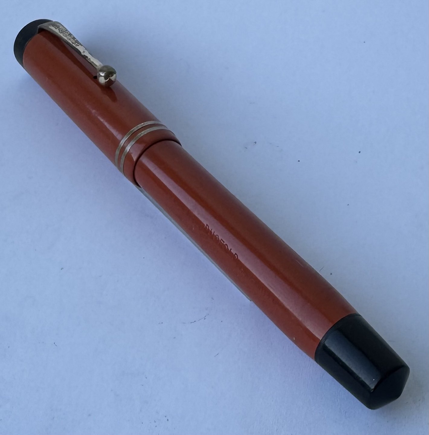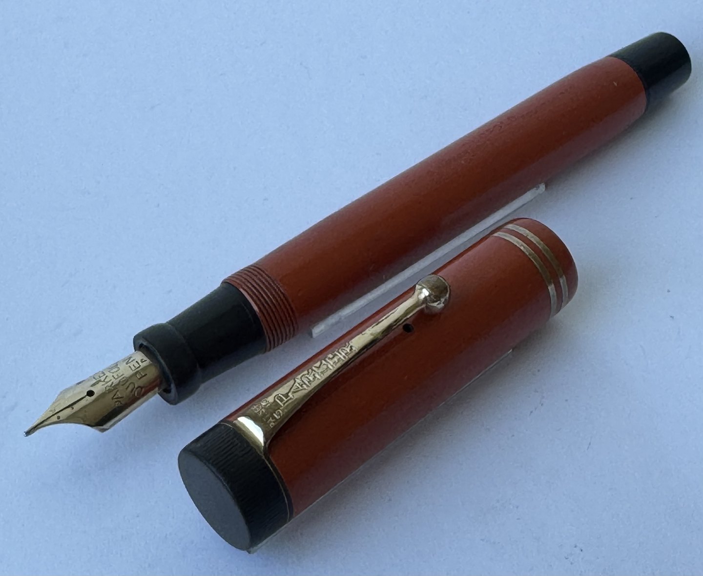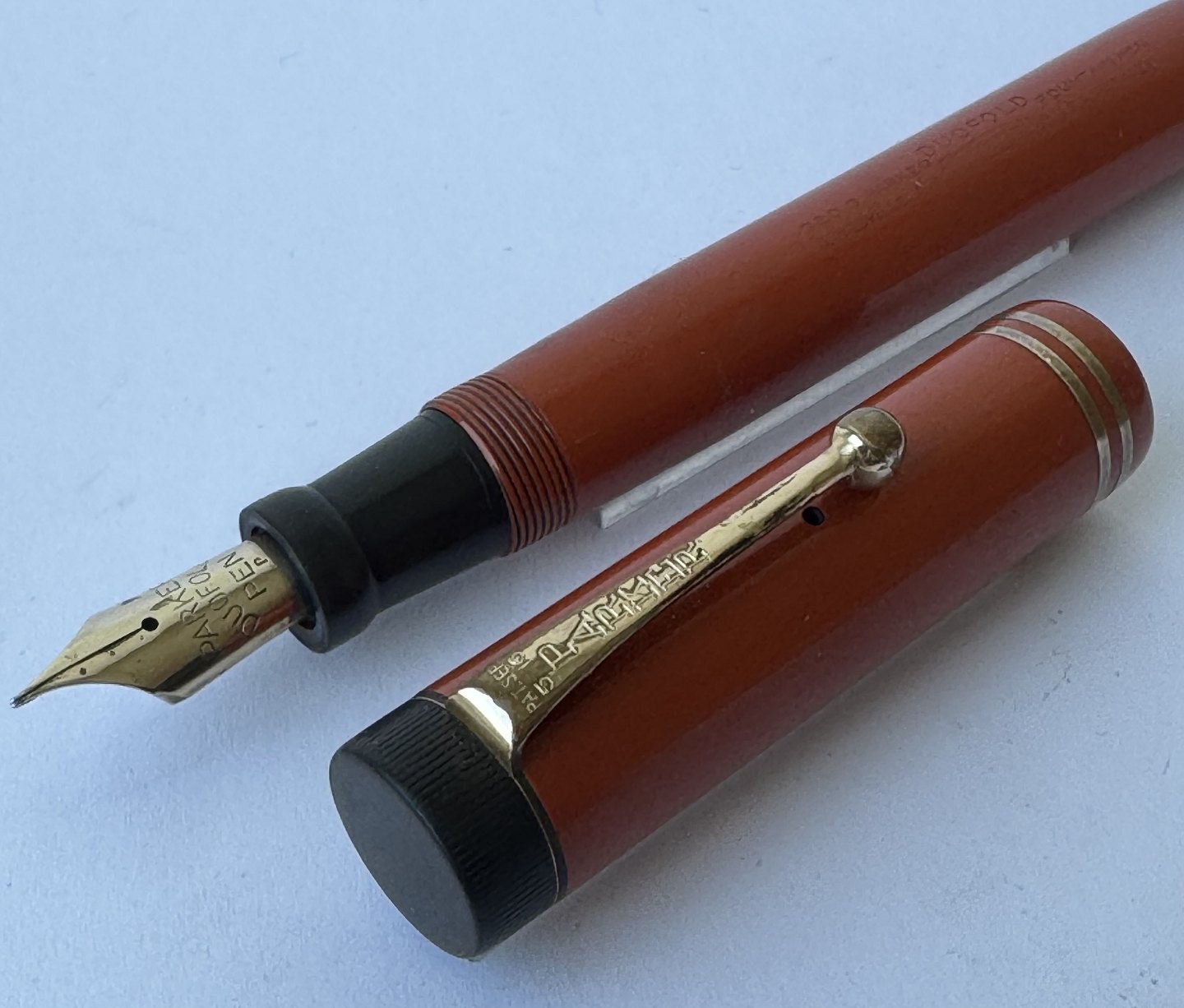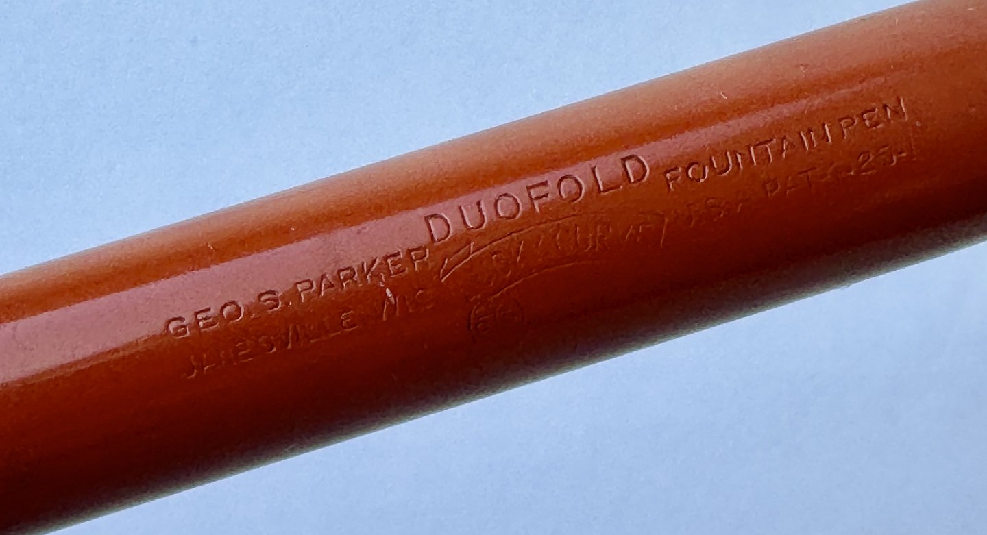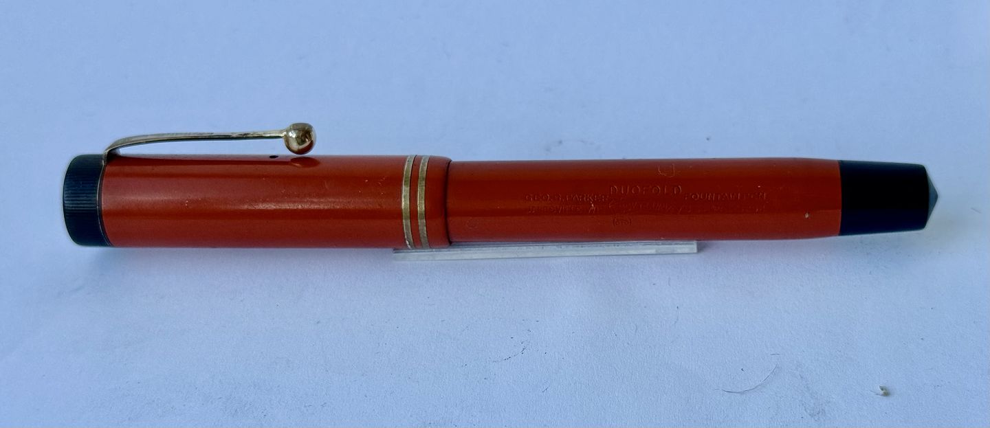 Stor koralrød Parker Duofold Lucky Curve fyldepen fra 1930'erne. Indgraveret personligt navn. Fremstillet i U.S.A. Fremstår I god stand uden skader eller reparationer. Push button blæk-påfylder. Der skal indsættes ny gummisæk før end den fungerer igen. Ny gummisæk kan indsættes for et tillæg på kr. 250,-