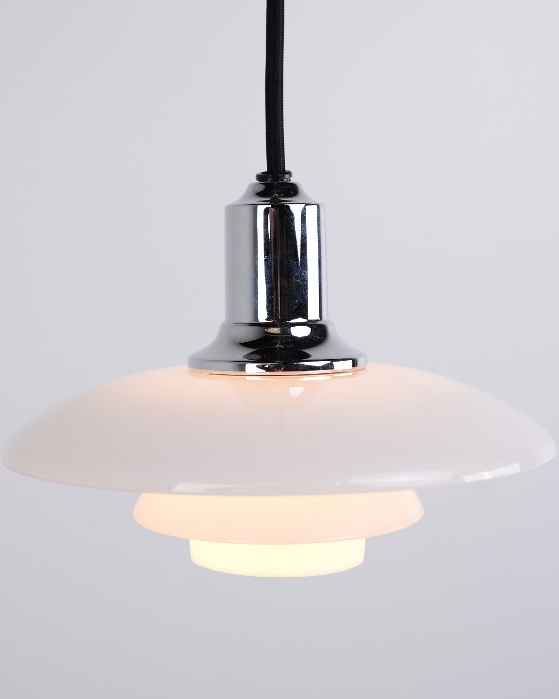 PH 2/1 pendel i krom med opalglas fra Louis Poulsen. Designet af Poul Henningsen med klassisk dansk lysdesign og blændfri belysning.