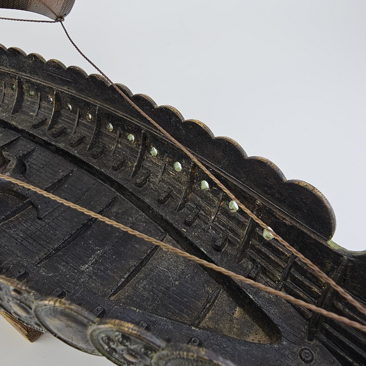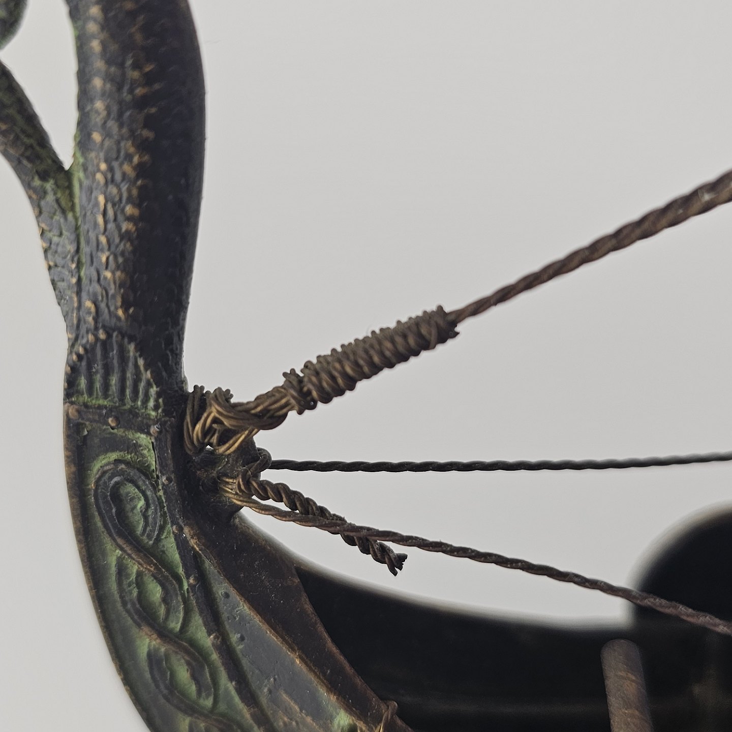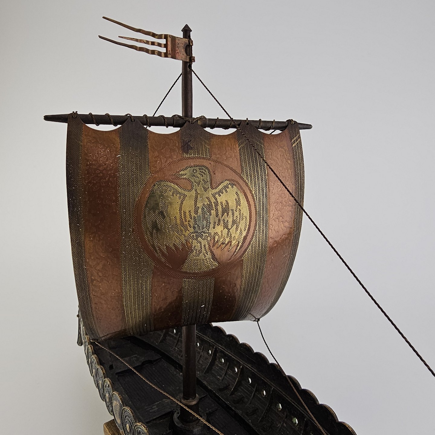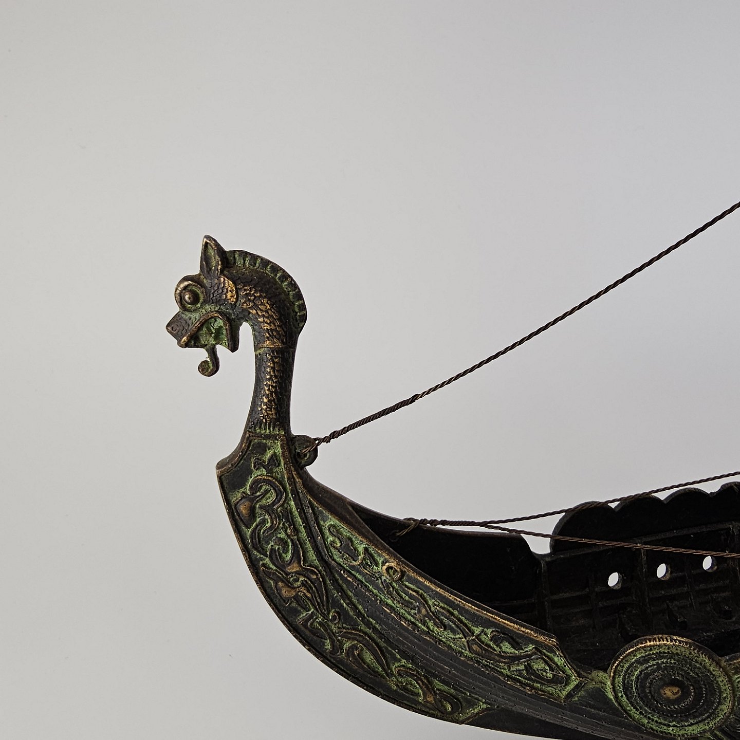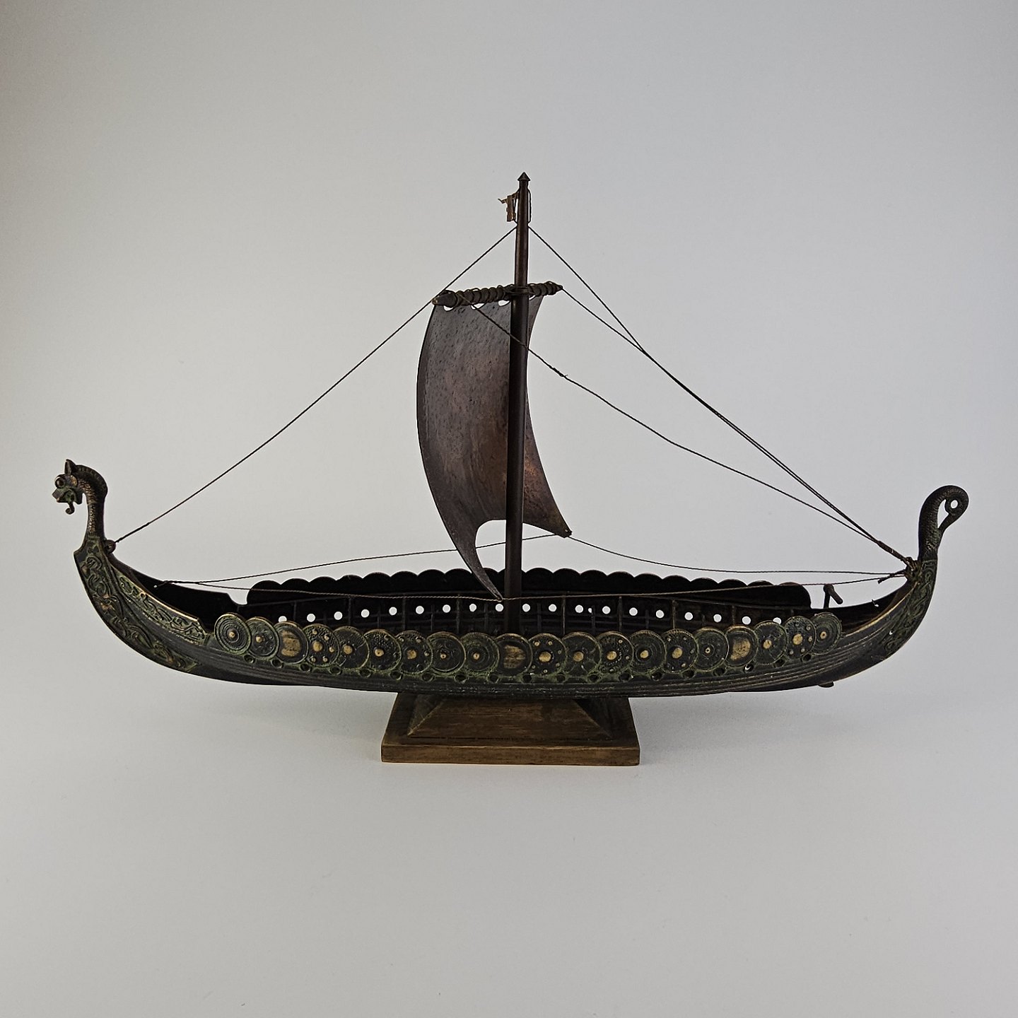Miniature replika af et dansk vikingeskib lavet i bronze med træfod