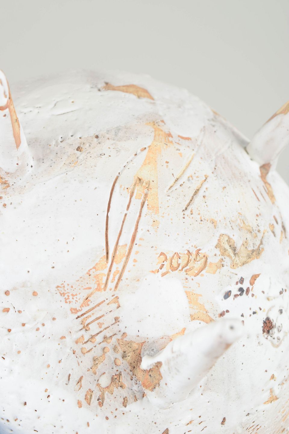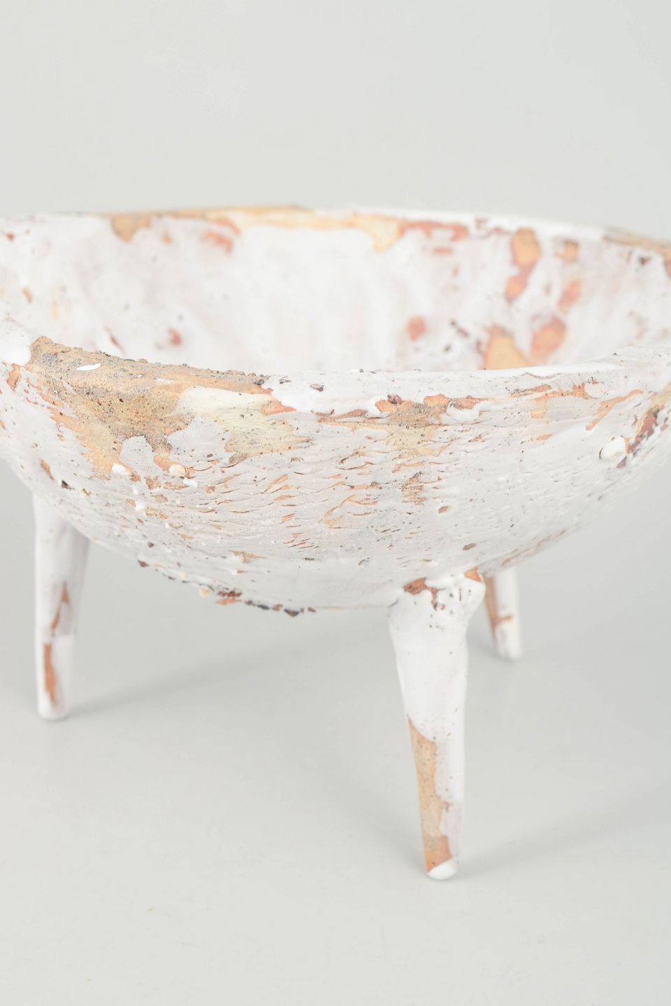 Unika Skål i genbrugt stentøjsler på tre spidse ben. Delvist glaseret fremstår den med det gyldne, brune og hvide områder. De brune områder er ler fra Danmark.