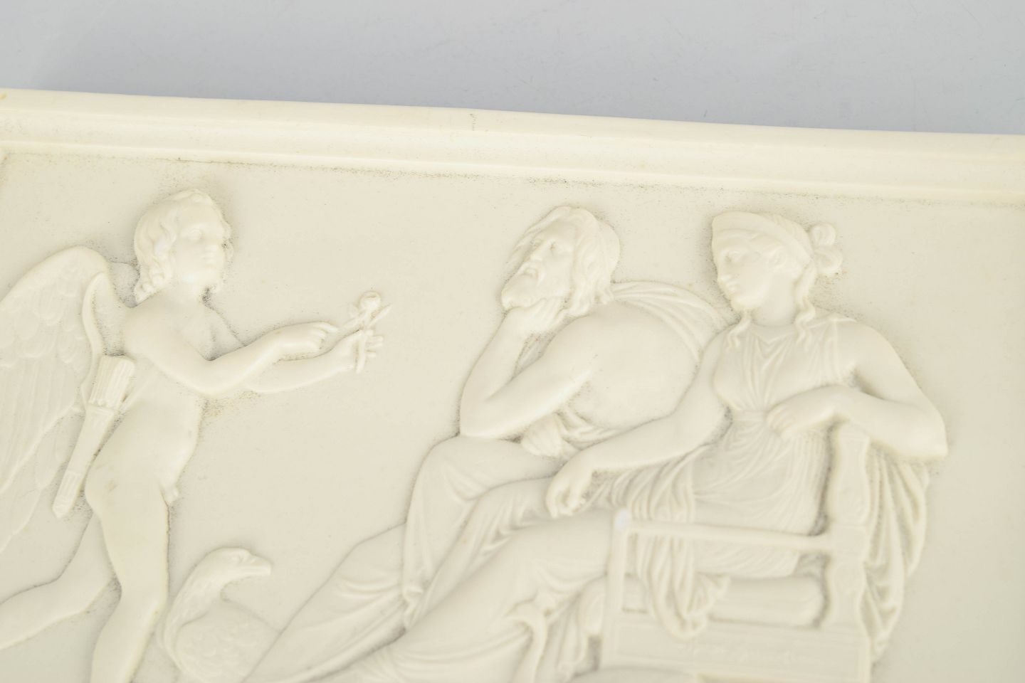 Rektangulært vægrelief i hvidt bisquitporcelæn med klassicistisk figurmotiv efter Bertel Thorvaldsen, udført med fine detaljer og blød modellering i nyklassicistisk stil.
