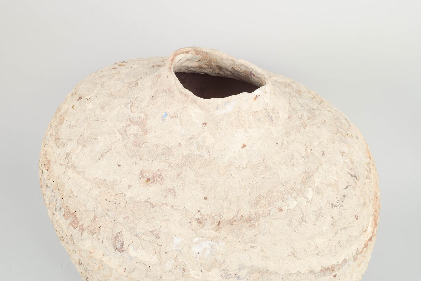 Stor unika rund stentøjsvase. Værket er uglaseret i kunstnerens signaturstil med blandede lertyper. Leret er genbrugsler, der er sammensat med tusindvis af kunstnerens tryk med fingrene, dette giver værket et taktilt, organisk og blødt udtryk. Kan ikke holde væske.