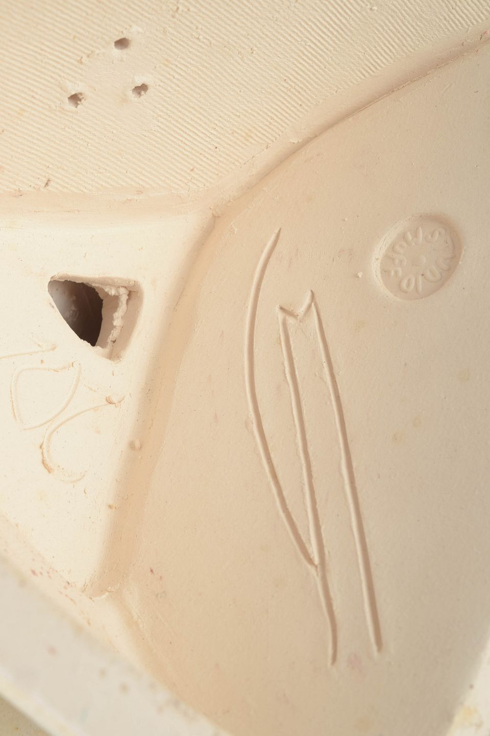 Monumentalt stor stentøjsskulptur i kubistisk stil, med blank cremefarvet glasur overflade.