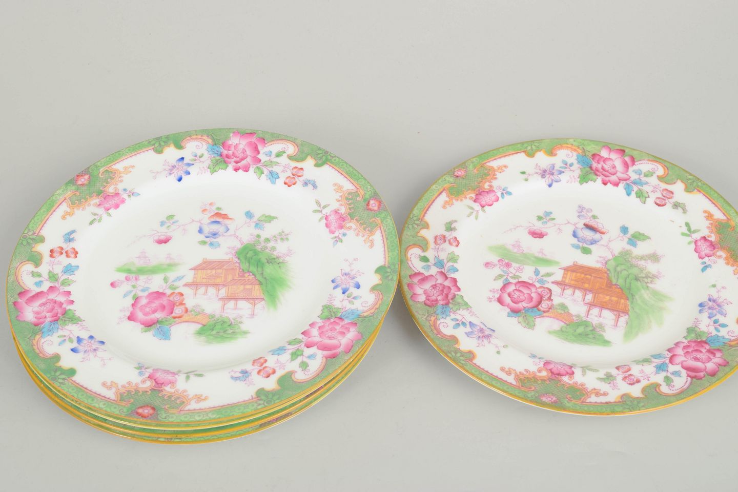 Dekorative tallerkener i porcelæn med farverig blomster- og landskabsdekoration i Temple mønster, med centrale orientalske motiver og grøn bort.