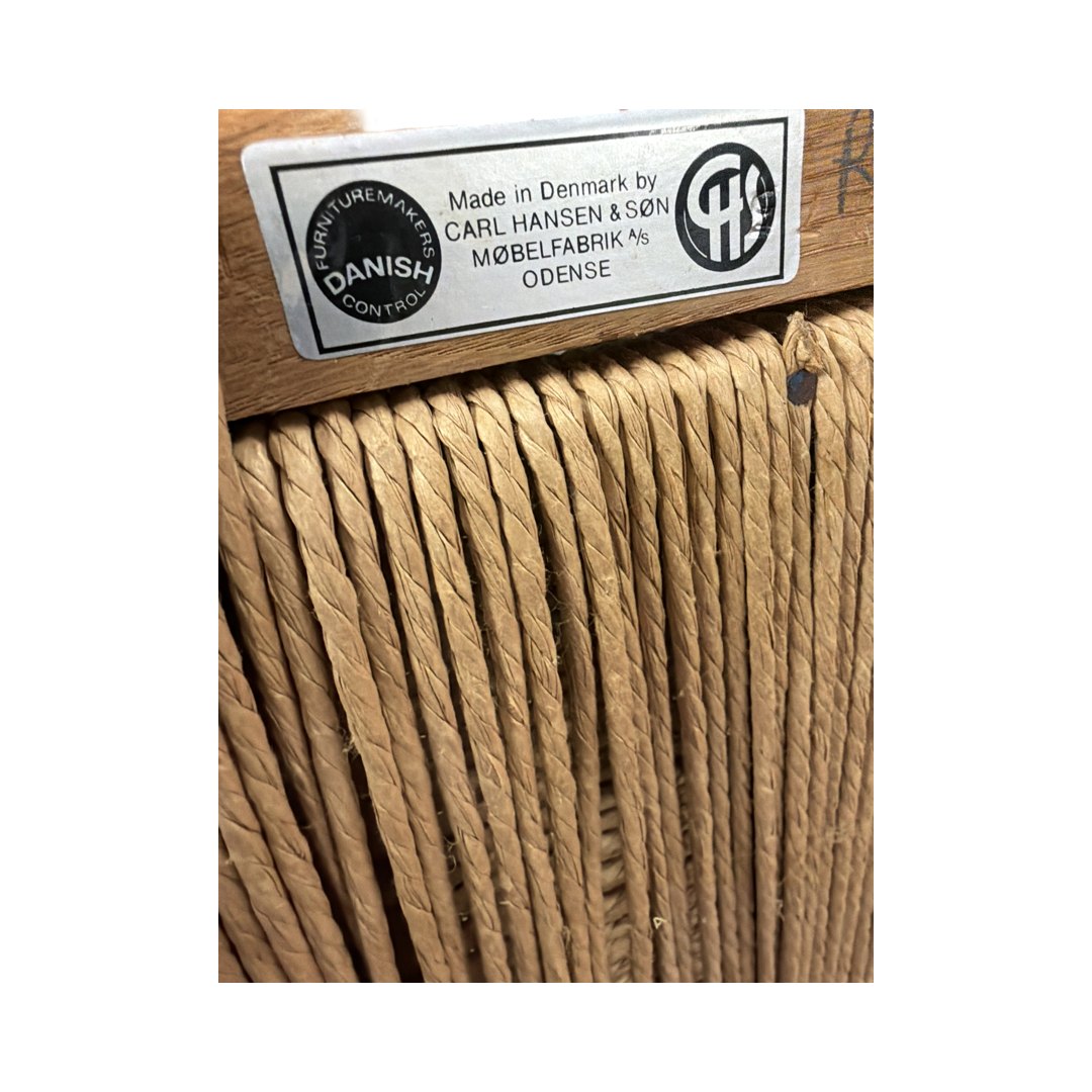 Stolene fremstår i smuk patineret egetræ med originalt papirflet – præcis den stand mange samlere og designelskere går efter.